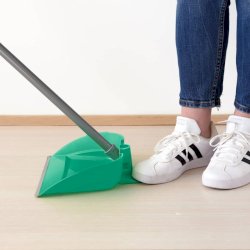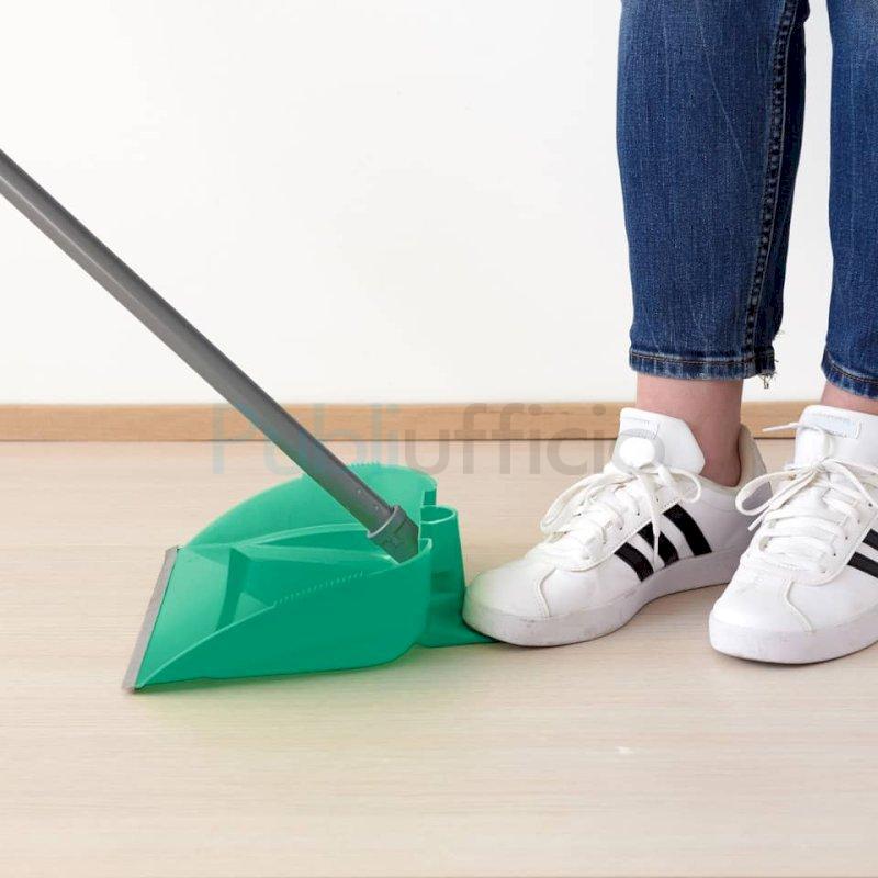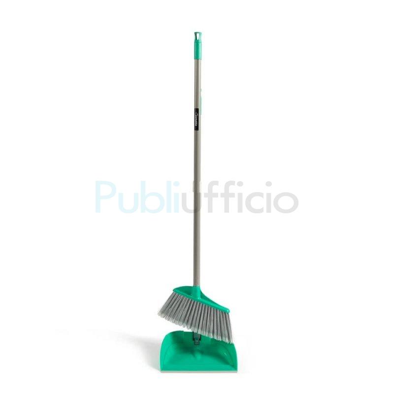 Paletta con manico lungo richiudibile più scopino, setole in fibra sintetica e profilo in gomma. Materiale: manico in ferro plastificato - paletta 100% polipropilene - assicella 100% polipropilene - filato 100% PET. Ideale per centri commerciali, negozi, ristoranti, hall, ecc.. Dimensioni: 25 x 24 x H.106 cm.