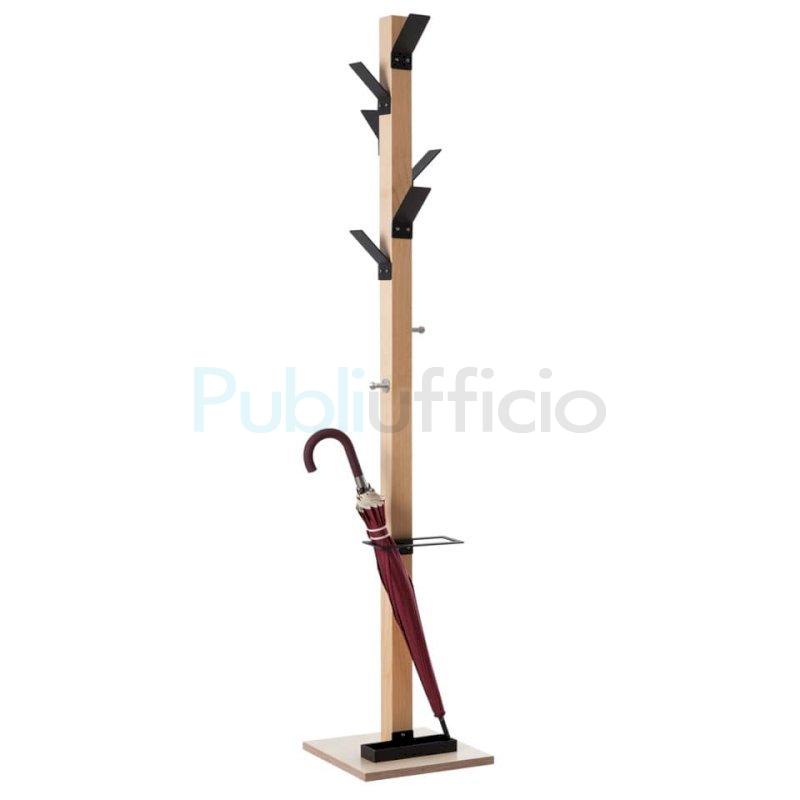 Appendiabiti da terra di design, con 6 ganci neri in poliestere resistenti gli urti, più 2 pomelli in acciaio cromato. Asta in legno massello faggio verniciato a sezione 60 x 60 mm. Corredati con anello portaombrelli e vaschetta raccogligocce. Base stabile in MDF 35x35 cm e spessore 20 mm. Dimensioni LxHxP: 35x180x35 cm. Consegnato smontato, di facile assemblaggio.