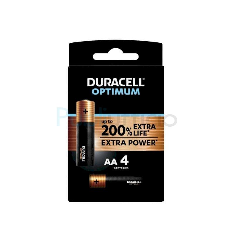 Batteria Alcalina AA stilo Optimum: extra durata ed extra potenza. Ciascun Blister contiene 4 batterie. Duracell Optimum dura più a lungo delle precedenti batterie alcaline Duracell in un'ampia gamma di dispositivi a medio e alto consumo. In altri dispositivi, Duracell Optimum offre più potenza rispetto alle precedenti batterie alcaline Duracell per far funzionare meglio i tuoi dispositivi.