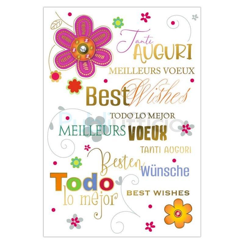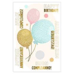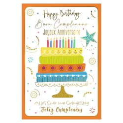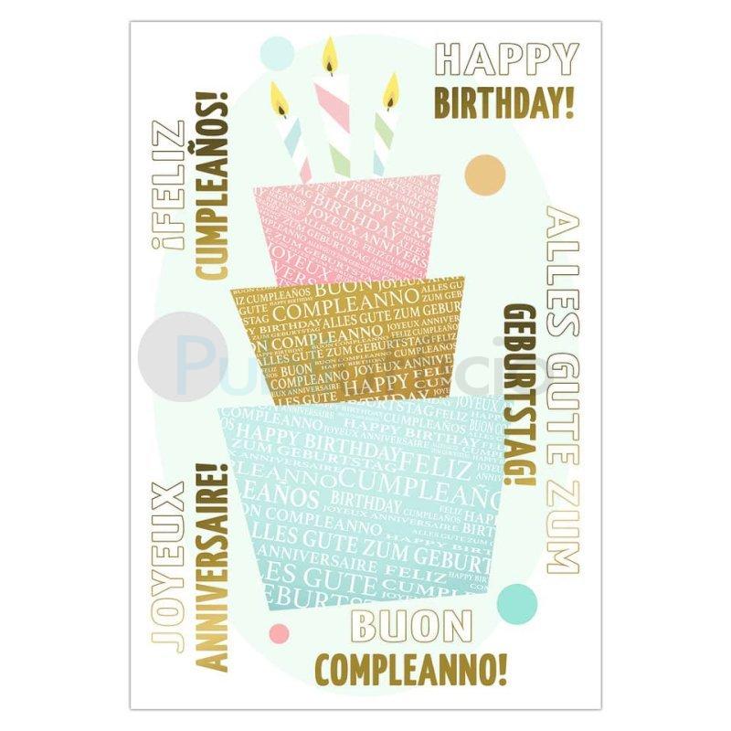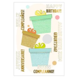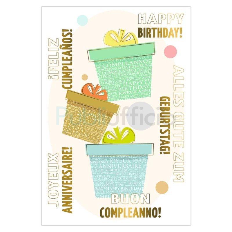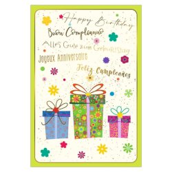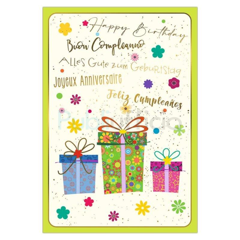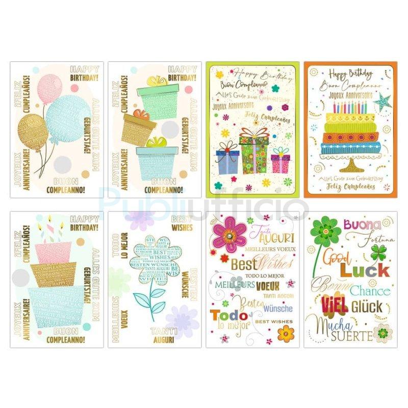 Biglietti augurali multilingua. Ideali per augurare un buon compleanno. Formato 12 x 18 cm. Frasi in diverse lingue con metal e glitter. Confezione da 8 pezzi assortiti.