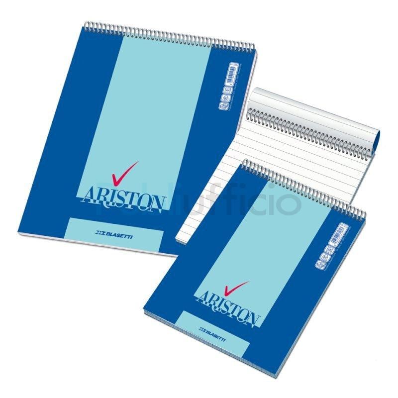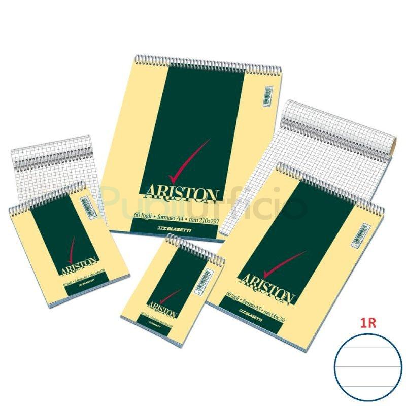 Blocco note spiralato Ariston formato A5. 60 fogli con carta da 60 g/m2. Rigatura 1R. Prodotto con energia solare. Formato A5: 15 x 21 cm.