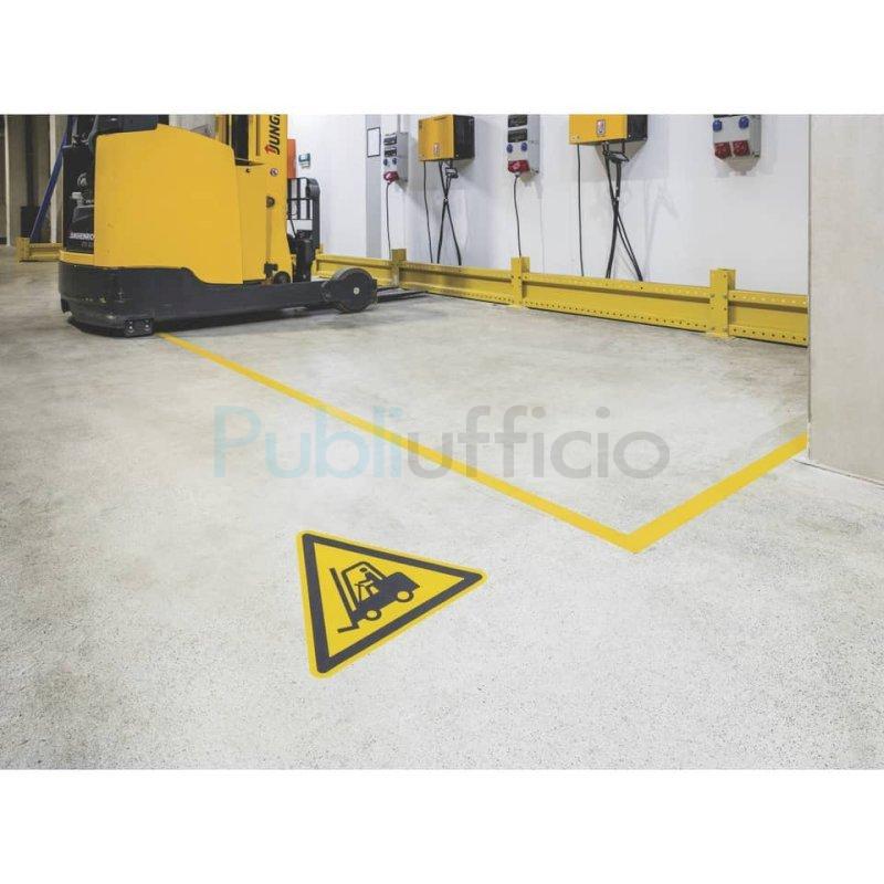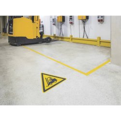 Bobina di nastro antiscivolo adesivo per la segnaletica orizzontale in ambienti interni, ideale per la marcatura e delimitazione permanente di passerelle, vialetti e zone non pedonali all'interno di magazzini e aree di produzione. Extra forte: realizzato con materiale estruso di alta qualità con spessore di 1,2 mm che lo rende robusto e resistente alle abrasioni; con bordi smussati. Resistenza allo scivolamento R10 e conforme alla normativa DIN 51130. Colore: RAL 1003 giallo segnale. Dimensioni (H x L): 50 mm x 30 m, spessore: 1,2 mm.