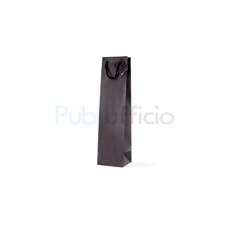 Borsa portabottiglie realizzata in carta kraft da 210 g/m² con manico in cotone e tag. Dotata di soffietto sia laterale sia sul fondo. Ha dei listelli di rinforzo e il cartoncino sul fondo è rigido. Dimensioni: 10+9 x H.39 cm. Colore nero. Ideale per regalare bottiglie, quali: vino, olio oppure liquori. Confezione composta da 10 pezzi.