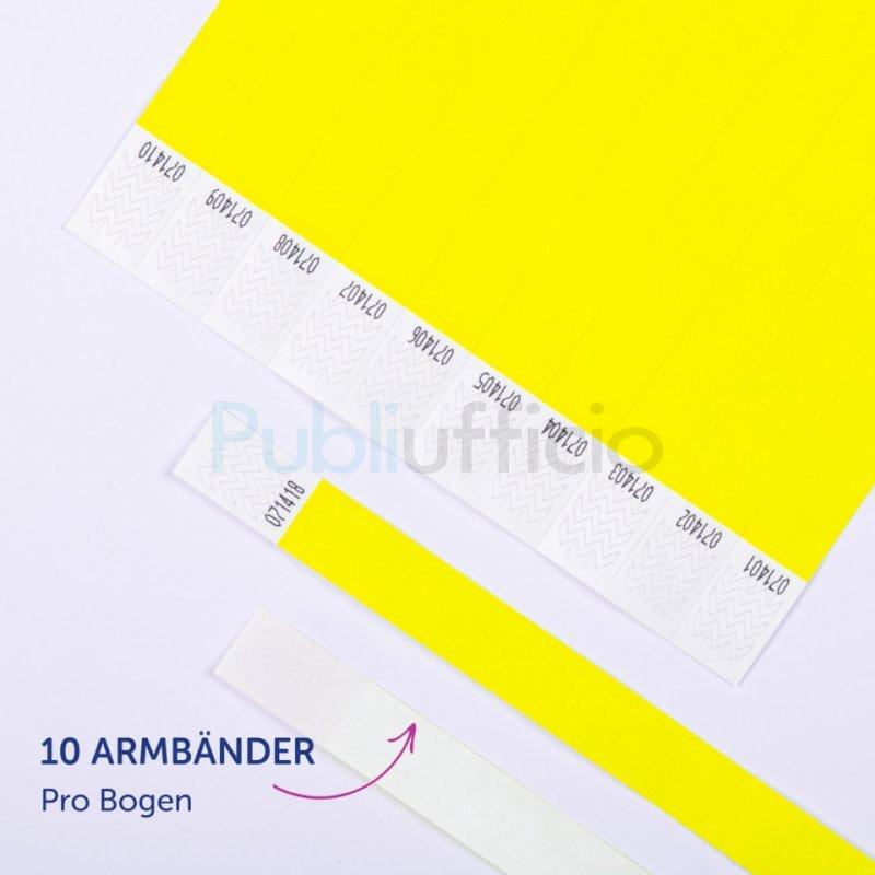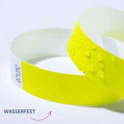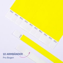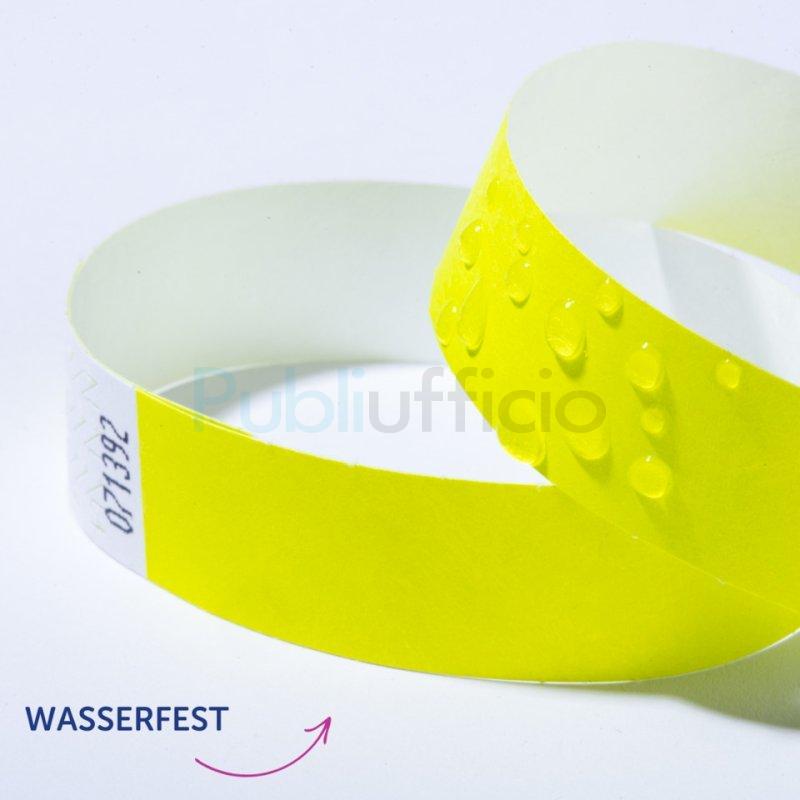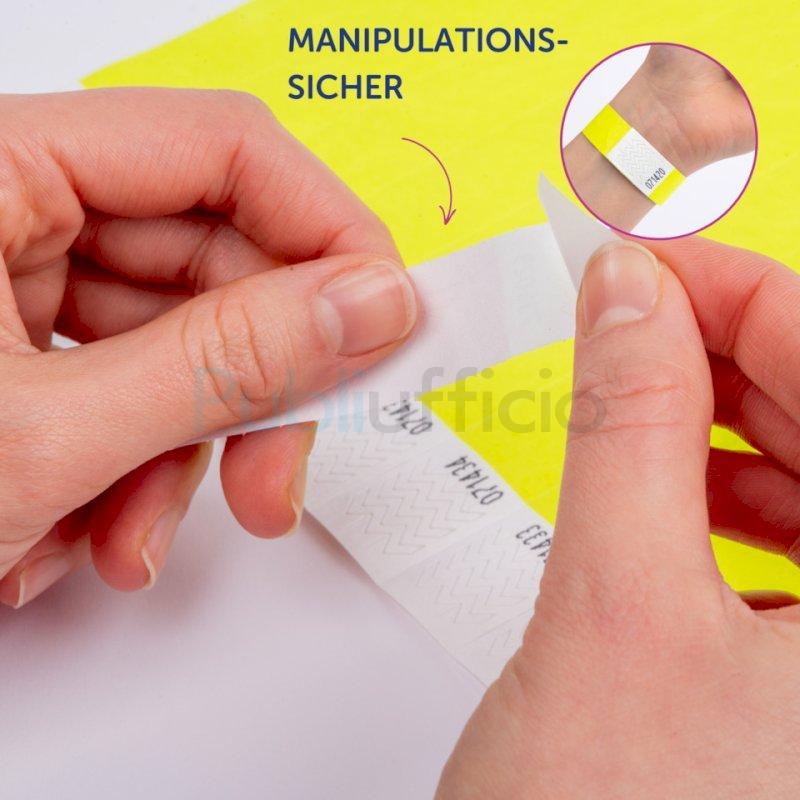 Braccialetti identificativi realizzati in Tyvek®, materiale composto da fibre di polietilene ad altà densità (HDPE). Perfetti per eventi pubblici e sportivi. Il materiale resistente, morbido e antistrappo li rende un accessorio indispensabile per identificare i partecipanti agli eventi. Resistono all'acqua e agli strappi. Sistema di chiusura adesivo adattabile a tutte le taglie di polso. Disponibili in diversi colori per diversificare i partecipanti agli eventi. Colore giallo fluo. Confezione composta da 500 pezzi.