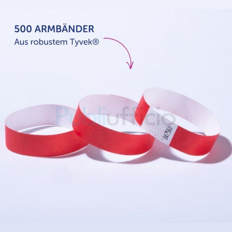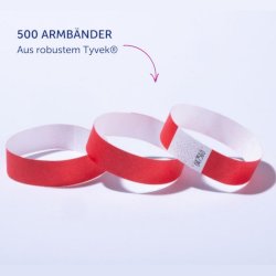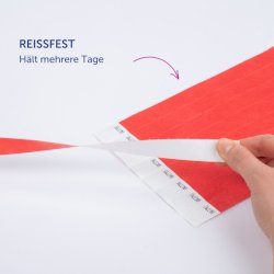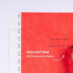 Braccialetti identificativi realizzati in Tyvek®, materiale composto da fibre di polietilene ad altà densità (HDPE). Perfetti per eventi pubblici e sportivi. Il materiale resistente, morbido e antistrappo li rende un accessorio indispensabile per identificare i partecipanti agli eventi. Resistono all'acqua e agli strappi. Sistema di chiusura adesivo adattabile a tutte le taglie di polso. Disponibili in diversi colori per diversificare i partecipanti agli eventi. Colore rosso fluo. Confezione composta da 500 pezzi.