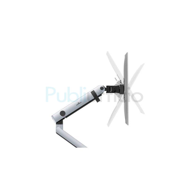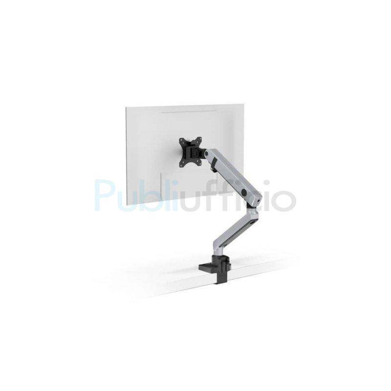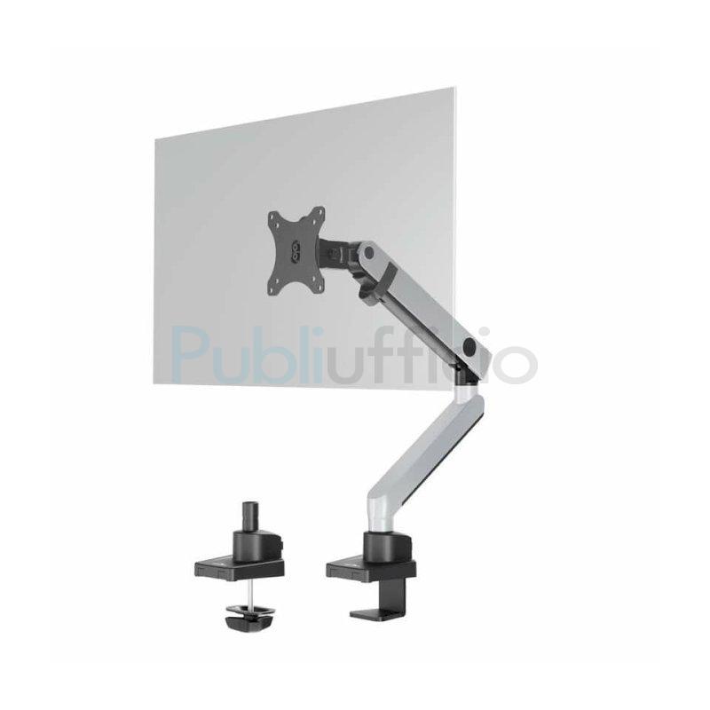 Braccio porta monitor con braccio estensibile per 1 monitor con doppia opzione di montaggio, con morsetto o perno per foro passacavo. Il monitor può essere regolato individualmente in altezza, inclinazione e orientamento per agevolare il lavoro ergonomico. Il monitor può essere ruotato di 90° per poterlo utilizzare sia in orizzontale che in verticale. Il braccio può essere posizionato facilmente grazie alla regolazione individuale della molla meccanica. Con montaggio universale VESA (75x75 mm o 100x100 mm). Per monitor standard fino a 32'' e con peso massimo fino a 8 Kg. Gestione dei cavi: i cavi del monitor sono guidati lungo il supporto da scanalature interne e clip ferma cavo che ne evitano il danneggiamento. Dimensioni: 530x450x108mm. Colore: argento metallizzato.
