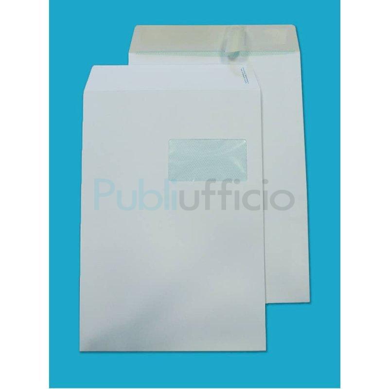 Busta a sacco bianca con finestra, lembo autoadesivo con strip removibile in carta da 100 g/m2. Prodotto certificato FSC. Colore bianco. Formato: 230 x 330 mm.