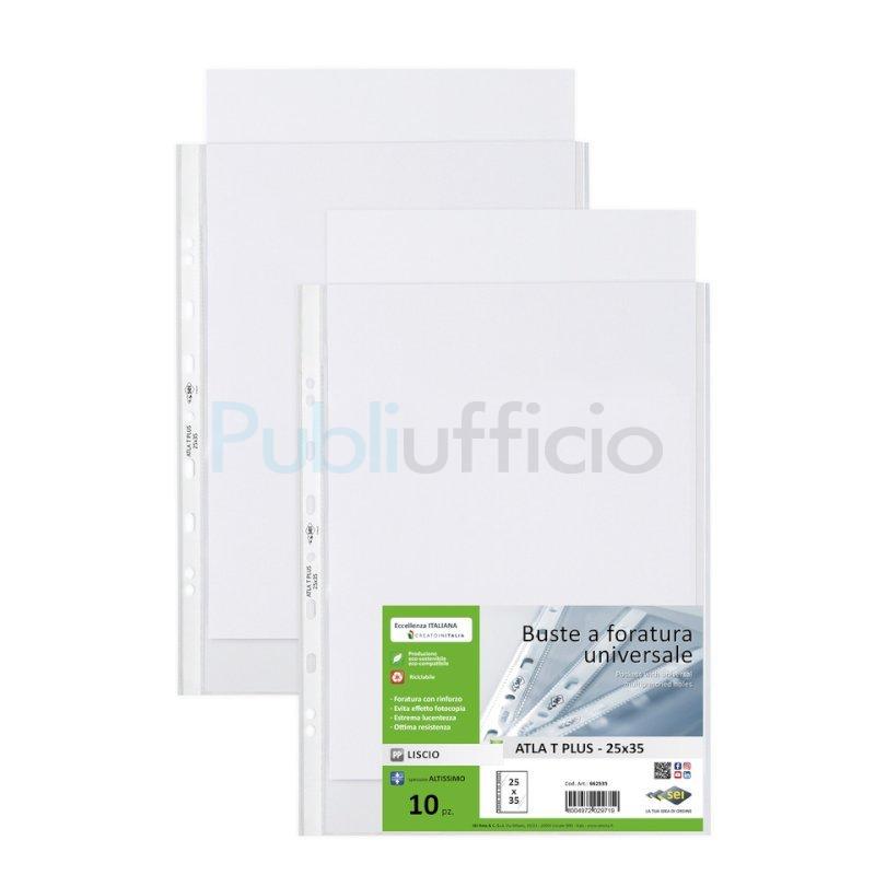 Buste in polipropilene con finitura liscia, altissimo spessore, con foratura universale rinforzata. Ideali per eleganti presentazioni o per archiviare documenti per anni. Il modo migliore per farsi notare. Formato 25x35 cm. Confezione da 10 buste.