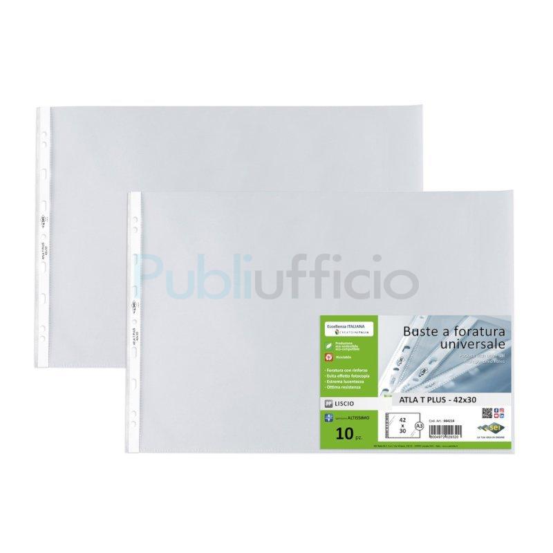 Buste in polipropilene con finitura liscia, altissimo spessore, con foratura universale rinforzata. Ideali per eleganti presentazioni o per archiviare documenti per anni. Il modo migliore per farsi notare. Formato 42x30 cm. Confezione da 10 buste.