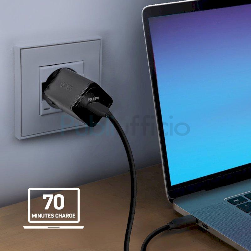 Potente e molto compatto grazie ai semiconduttori GaN. Il caricatore da 45 Watt è realizzato con semiconduttori in nitruro di gallio (GaN). Gli accessori con questa caratteristica sono più compatti ma, allo stesso tempo, molto potenti. La scocca del caricatore da rete GaN misura solamente 50x30 mm e può essere, dunque, facilmente riposto in una borsetta o uno zainetto. Portalo sempre con te nei tuoi viaggi: la spina europea garantisce la compatibilità in molti paesi del mondo. Ricarica in maniera ultrarapida tutti i tuoi dispositivi. Il caricabatterie GaN da 45 Watt ricarica smartphone, tablet, smartwatch, auricolari TWS, speaker di molte marche come Apple, Samsung, Huawei, Xiaomi, Oppo. Questo caricabatterie può anche alimentare qualsiasi laptop e MacBook Air (verifica le specifiche tecniche del tuo dispositivo da ricaricare). La tecnologia Power Delivery assicura performance e sicurezza. La tecnologia Power Delivery (PD) può alimentare con maggiore potenza i dispositivi ricaricati. Appena inserirai un tuo cavo compatibile nella porta USB-C, il caricatore da muro GaN erogherà energia a 45 Watt permettendo, così, di ricaricare uno smartphone in 20 minuti, un tablet in 40 ed un laptop in 70 (i tempi di ricarica sono indicativi e dipendono dalla capacità della batteria del device in carica). Power Delivery significa anche sicurezza: i prodotti dotati di tale tecnologia, infatti, sono progettati per comunicare direttamente con il dispositivo per controllare la corretta quantità di energia da erogare. In questo modo, surriscaldamenti e cortocircuiti saranno sempre evitati. Design smart: pratico e funzionale. Il suo particolare design assicura praticità: da qualsiasi verso lo inserirai nella spina a muro non avrai difficoltà ad inserire il tuo cavo di ricarica. Cosa lo contraddistingue: dotato di 1 porta USB-C; GaN: molto potente ma più piccolo di un caricatore normale; universale (verifica le specifiche tecniche del tuo dispositivo da ricaricare); eroga energia a 45 Watt: smartphone carico in 20 minuti, tablet in 40, laptop in 70 (i tempi di ricarica sono indicativi e dipendono dalla capacità della batteria del device in carica); tecnologia Power Delivery: garantisce potenza e sicurezza; spina europea; dimensioni della scocca: 50x30 mm.