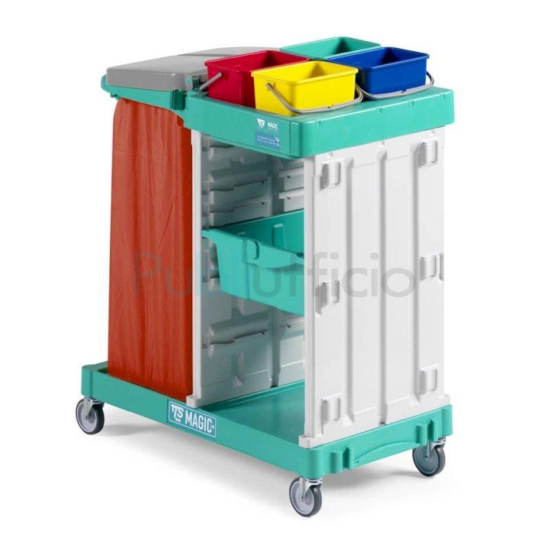 Magic Line 300 Basic TTS è il carrello multiuso a 2 reparti con capacità di raccolta 120 L e stoccaggio con cassetto. Ruote 100 mm. Il carrello in polipropilene è modulare e accessoriabile per rispondere ad ogni esigenza di pulizia. Ideale per il trasporto di attrezzatura. I montanti in plastica separano nettamente i moduli del carrello evitando contaminazioni tra la zona di lavaggio, stoccaggio e raccolta rifiuti. Equipaggiato con secchielli 4 L di colore diverso. Dimensioni 92 x 55 x 110 cm. Sacco e coperchio non in dotazione.