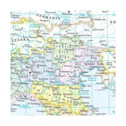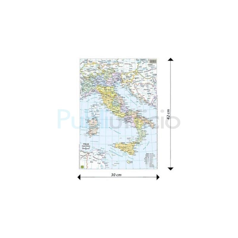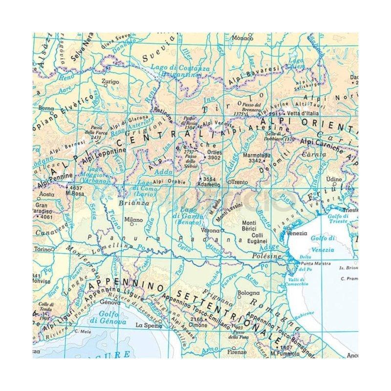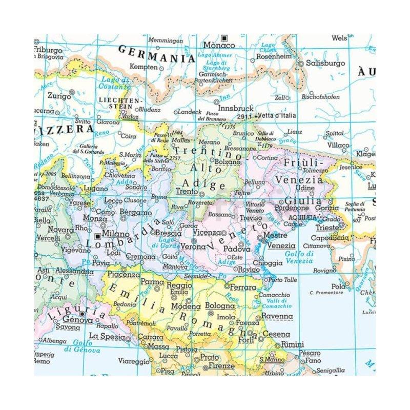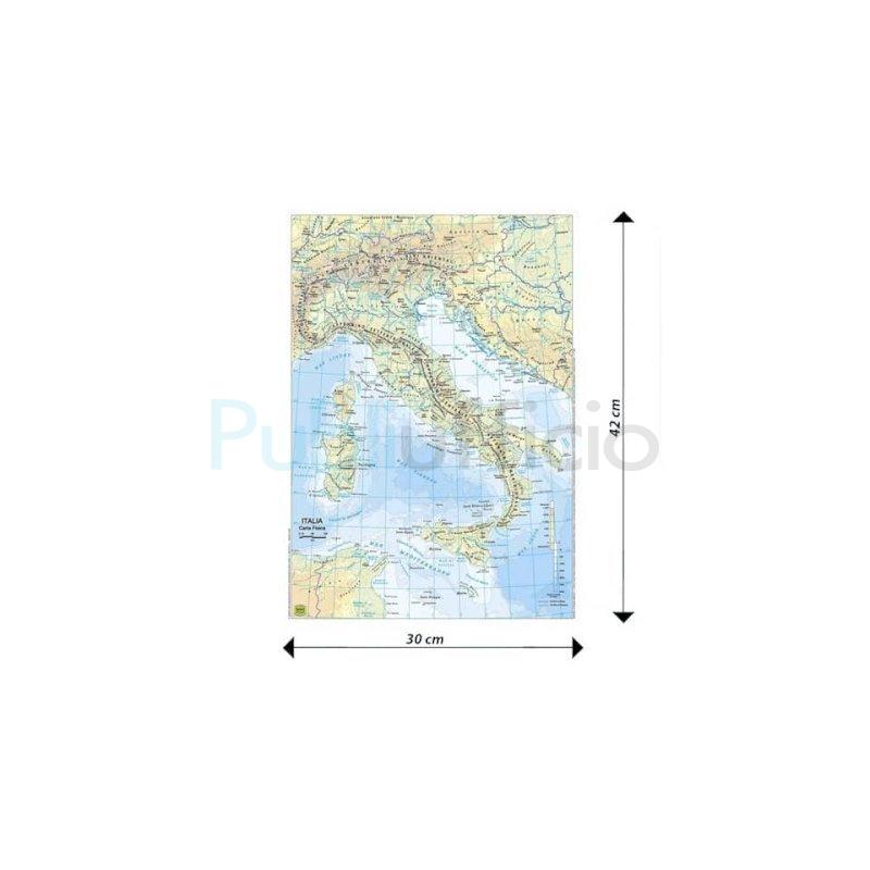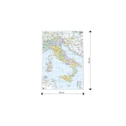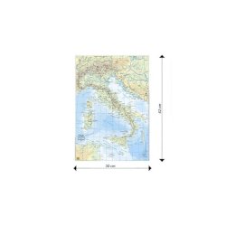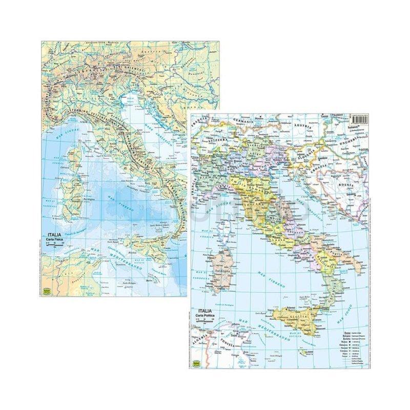 La cartografia dell’Italia è basata sulla proiezione conforme di Gauss-Boaga e rappresenta l’aspetto fisico dell’Italia da un lato e quello politico dall’altro. Il taglio comprende l’intero bacino dell’Adriatico. Nel lato con la parte fisica emerge la conformazione dei sistemi montuosi e dei fondali marini grazie a una scala di colori armonica che non disturba la leggibilità. La toponomastica, oltre a definire i principali elementi geografici, cura in particolare la delimitazione delle catene montuose con i relativi passi e si estende agli specchi d’acqua e alle regioni fisiche minori. Il lato con la versione politica è ricco di colori brillanti nel rispetto dell’armonia estetica e della leggibilità. All’interno delle regioni si distinguono le province con i rispettivi capoluoghi. Le città si distinguono per grandezza con una simbologia appropriata. In entrambe le versioni è curata la dizione italiana dei toponimi esteri e l’uso degli accenti è esteso alle parole sdrùcciole. Plastificata per fornire la massima protezione, è economica e duratura, ideata specificatamente per l’uso nelle scuole. Carta da banco dell'Italia, formato 30 x 42 cm (A3).