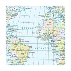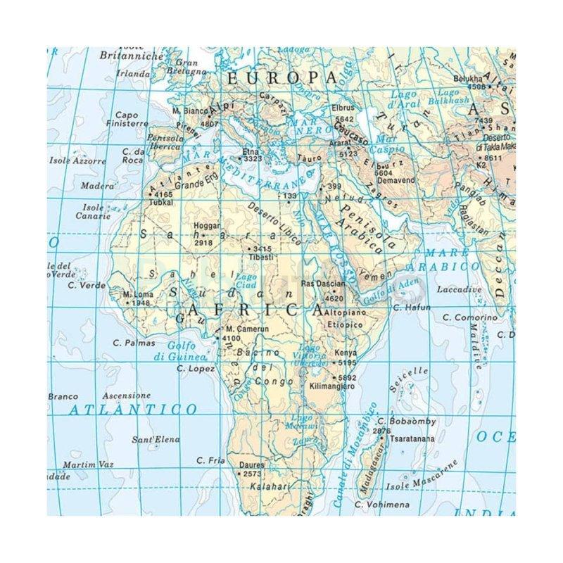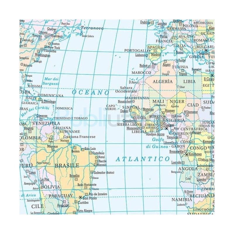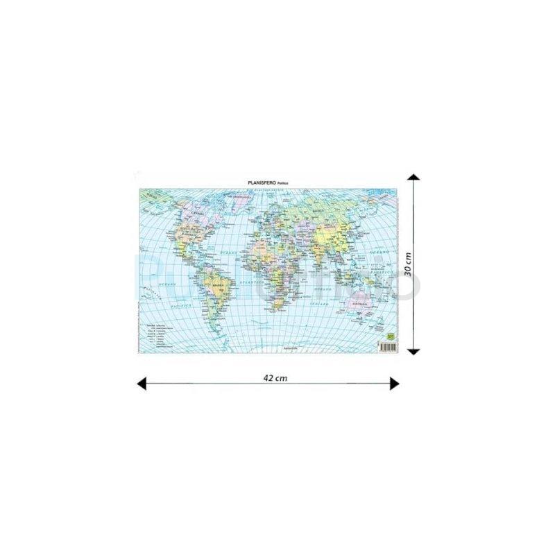 La carta scolastica da banco del Mondo in formato A3 è stampata su entrambi i lati. Un lato rappresenta l’aspetto fisico della terra su un lato e quello politico dall’altro. L’uso dei colori è bilanciato per salvaguardare sia la brillantezza che la leggibilità della carta. Le città si distinguono per grandezza con una simbologia appropriata. Nella parte fisica emerge la conformazione dei sistemi montuosi e dei fondali marini grazie a una scala di colori armonica che non disturba la leggibilità. Plastificata per fornire la massima protezione, è economica e duratura, ideata specificatamente per l’uso nelle scuole. Carta da banco del Mondo, formato 42 x 30 cm (A3).