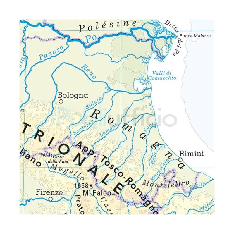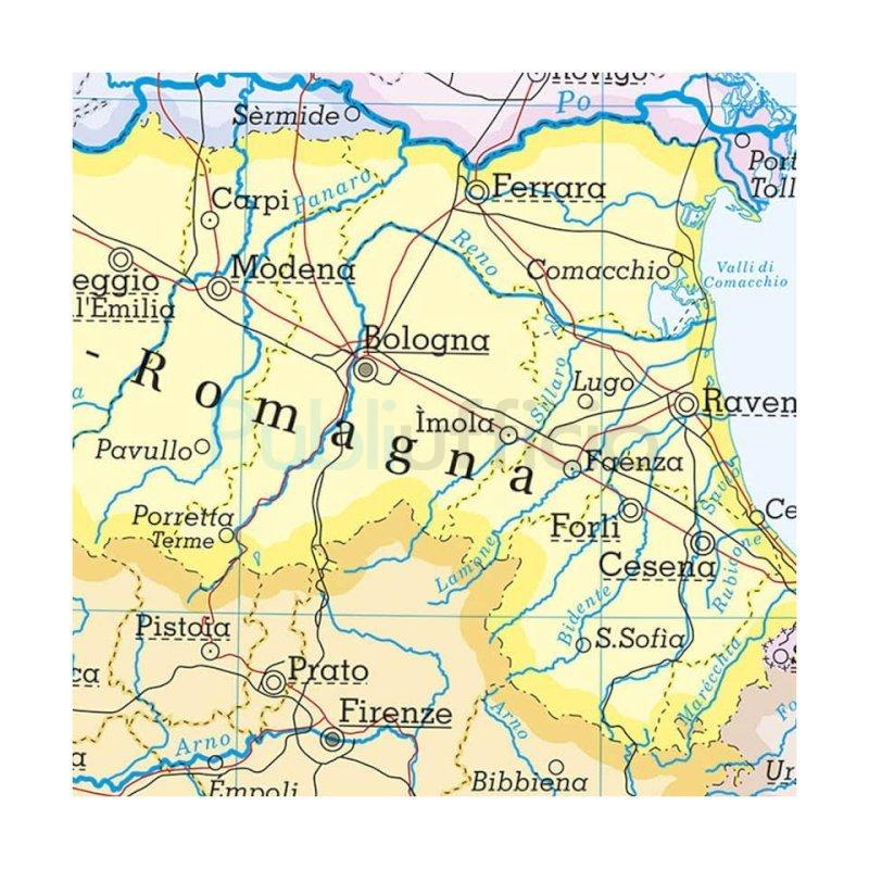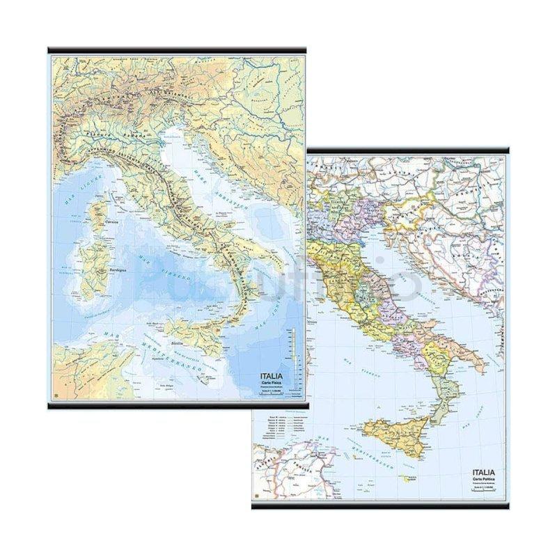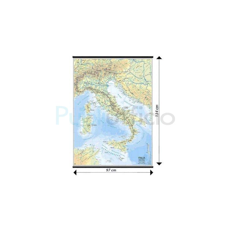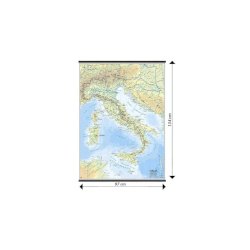 Carte murali scolastiche per la didattica, grazie alla cartografia basata sulla proiezione conforme di Gauss-Boaga rappresenta l’aspetto fisico dell’Italia da un lato e quello politico dall’altro. Il taglio comprende l’intero bacino dell’Adriatico. Nella parte fisica emerge la conformazione dei sistemi montuosi e dei fondali marini grazie a una scala di colori armonica che non disturba la leggibilità. La toponomastica semplificata, oltre a definire i principali elementi geografici, cura in particolare la delimitazione delle catene montuose con i relativi passi e si estende agli specchi d’acqua e alle regioni fisiche minori. Grazie alla speciale plastificazione opaca antiriflesso è garantita un’ottima leggibilità in ogni condizione di luce. Cartina dell'Italia, formato 97 x 134 cm.