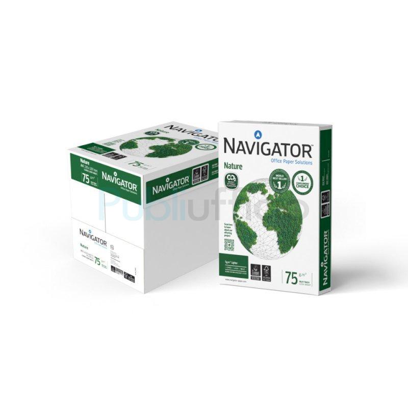 Carta per fotocopie Navigator Nature. Formato: A3. Grammatura: 75 g/m². Punto di bianco 169 CIE. Ideale per stampanti laser e a getto d'inchiostro, nonché per fotocopiatrici. Prodotto certificato FSC ed Ecolabel. Disponibile in risma da 500 fogli.