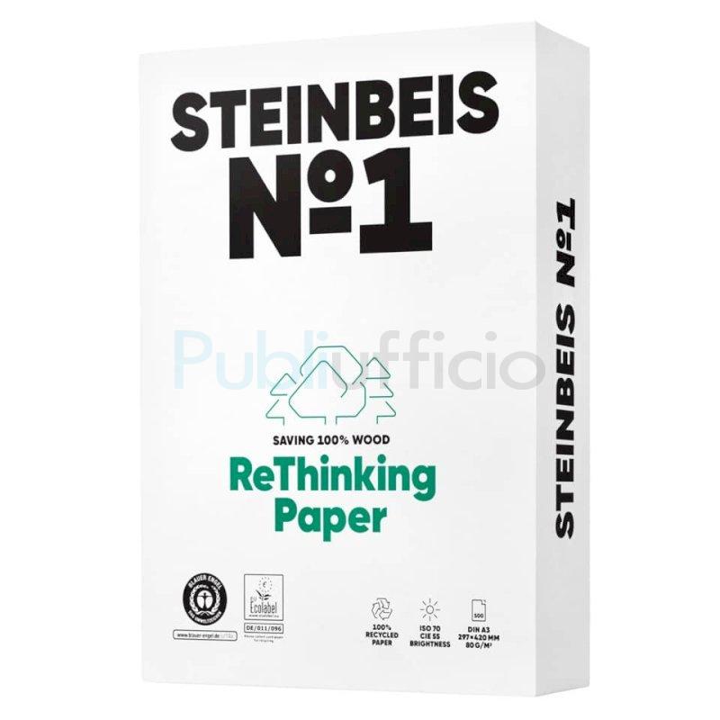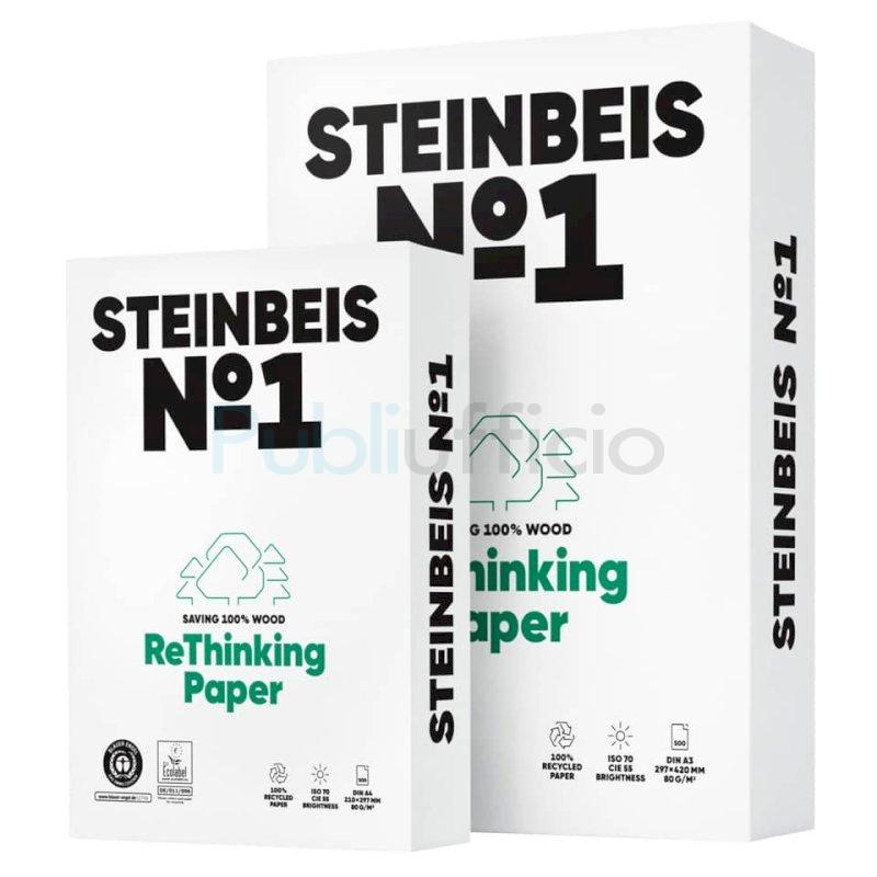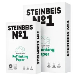 Steinbeis No. 1 è ottenuta al 100% da carta riciclata senza l’impiego di cloro o candeggianti al cloro. La carta è certificata secondo gli standard ecologici Blue Angel ed EU-Ecolabel. Al termine del suo uso, la carta può essere riciclata per intero. Steinbeis No. 1 è adatta a qualsiasi stampante laser e a getto d’inchiostro comune. Le fibre ecosostenibili della materia prima e il processo di produzione all’interno di una fabbrica integrata, fanno di questo prodotto l’alternativa ecologica alle carte con fibre vergini. Formato: A3. Grammatura: 80 g/m². Spessore 102 μm. Grado di bianco CIE 55. Opacità >95%. Risma da 500 fogli.