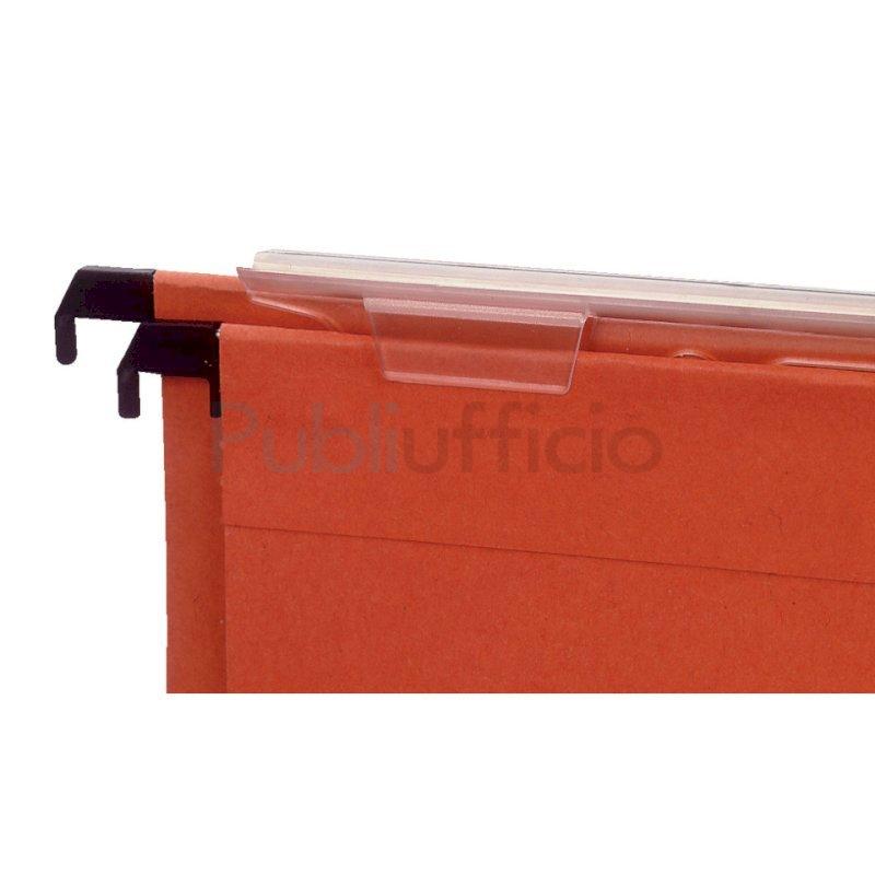 Cartella a lettura superiore per cassetti in robusto cartoncino orange kraft. Ganci di sostegno in nylon con astina in acciaio fissati alla cartella con incollatura Hot Melt. Portacartellino Scope già montato. Interasse mm 330, fondo mm 30.