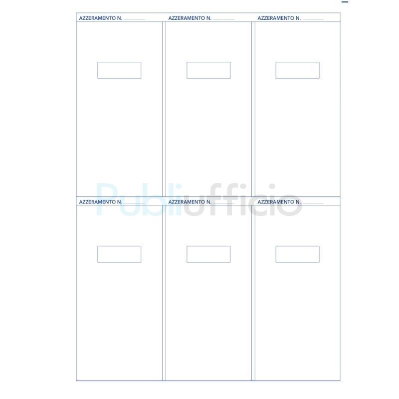 Registro per archivio azzeramenti giornalieri. Composizione: copertina, sottofondo con tre lembi, 13 fogli interni stampati 1+1, 14 fogli bianchi e 1 foglio con etichette (160 doppio etichettine). Cartellina con rilegatura a spirale metallica.