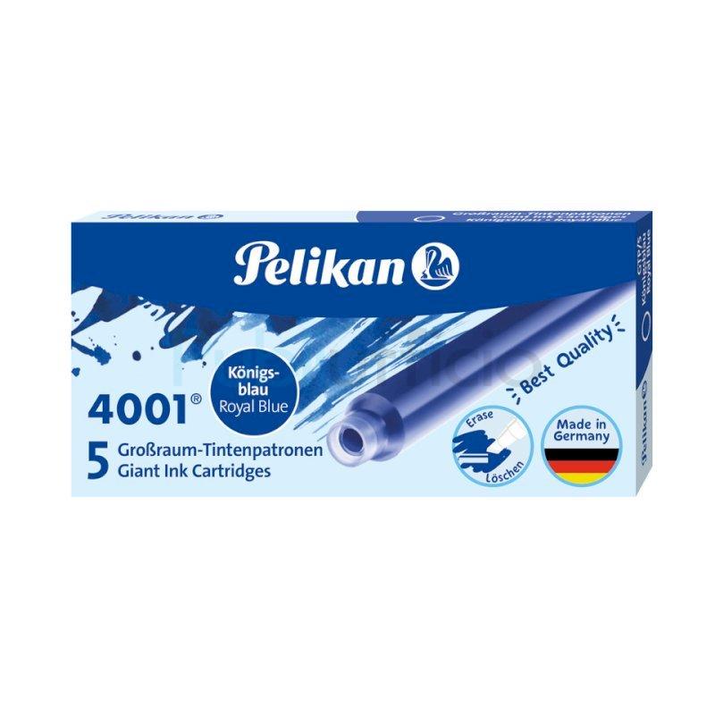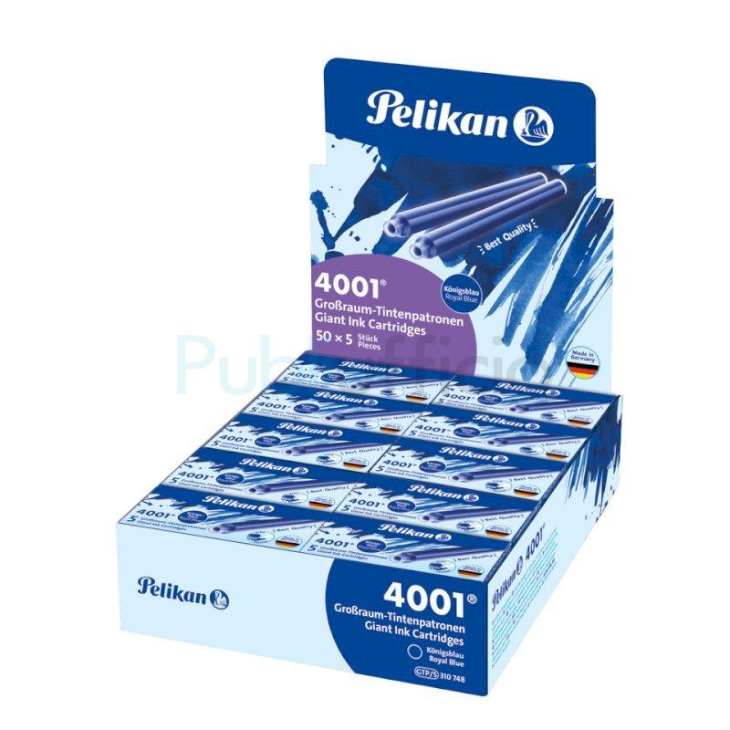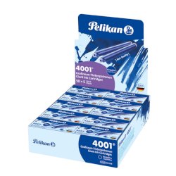 Cartucce 4001 per stilografiche versione GTP/5, che corrisponde a 2 cartucce TP/6. Inchiostro di ottima qualità in tanti colori brillanti. Nella versione blu royal, il tratto è cancellabile con i cancellatori d’inchiostro Pelikan e si toglie dai tessuti con acqua e sapone. Confezione da 5 pezzi, colore blu royale. 50 confezioni da 5 compongono l'espositore.