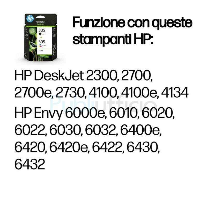 Cartuccia 305 combo tricololore/nero, resa 120 pagine il nero e 100 pagine i colori. Compatibile con: Stampante multifunzione HP ENVY 6020e Stampante multifunzione HP ENVY 6022e Stampante multifunzione HP ENVY 6430e Stampante multifunzione HP ENVY 6432e Stampante multifunzione HP ENVY 6420e Stampante multifunzione HP DeskJet 2720e Stampante multifunzione HP DeskJet 2721e Stampante multifunzione HP DeskJet 2722e Stampante multifunzione HP DeskJet 2723e Stampante multifunzione HP DeskJet 2710e Stampante multifunzione HP DeskJet 4120e Stampante multifunzione HP DeskJet 4110e Stampante multifunzione HP DeskJet 4122e Stampante multifunzione HP DeskJet 4130e Stampante multifunzione HP ENVY 6030e Stampante multifunzione HP ENVY 6032e Stampante multifunzione HP ENVY 6010e Stampante multifunzione HP ENVY 6020e Stampante multifunzione HP DeskJet Plus 4120 Stampante multifunzione HP DeskJet 2720 Stampante multifunzione HP DeskJet 2710 Stampante multifunzione HP ENVY 6020 Stampante multifunzione HP ENVY 6022 Stampante multifunzione HP ENVY 6030 Stampante multifunzione HP ENVY 6032 Stampante multifunzione HP ENVY 6010 Stampante multifunzione HP ENVY Pro 6420 Stampante multifunzione HP ENVY Pro 6422 Stampante multifunzione HP ENVY Pro 6430 Stampante multifunzione HP ENVY Pro 6432 Stampante multifunzione HP DeskJet 2724 Stampante multifunzione HP DeskJet 2722 Stampante multifunzione HP DeskJet 2721 Stampante multifunzione HP DeskJet 2723 Stampante multifunzione HP DeskJet Plus 4130 Stampante multifunzione HP DeskJet Plus 4122 Stampante multifunzione HP DeskJet Plus 4110 HP DeskJet 2320 All-in-One Printer.