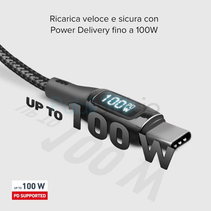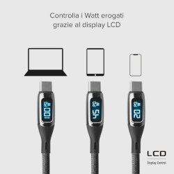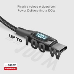 Adatto al trasferimento di energia, ma anche di foto, video e musica a tutta velocità. Il cavo dati con connettori USB-C maschio è perfetto per connettere tra di loro dispositivi dotati di una porta USB-C compatibile. Puoi trasferire energia, ma anche dati come foto, video e musica in modo ultra rapido e sicuro. Il cavo supporta infatti la tecnologia di alimentazione Power Delivery (PD) fino ad una potenza massima di 100 Watt per laptop, 45 Watt per tablet e fino a 20 Watt per smartphone compatibili, trasportando energia tra i device in completa sicurezza e al massimo della velocità. Puoi tenere sempre sotto controllo il livello di energia erogata. Grazie ai due schermi digitali LCD presenti su entrambi i connettori potrai sempre monitorare il livello di energia erogata durante la messa in carica dei tuoi dispositivi. Inoltre potrai sapere se la tecnologia Power Delivery è attiva o meno. Scarica tutte le foto che vuoi in pochissimo tempo. In pochi istanti potrai scaricare tutte le immagini e i clip che vuoi dalla tua fotocamera o dalla GoPro sul tuo laptop con una velocità pari a 480 MBit/s. Puoi trasferire 1 Giga di dati in soli 17 secondi. I 2 connettori USB-C reversibili ti permettono poi un rapido e comodo inserimento in entrambi i versi. La soluzione di ricarica comoda, perfetta per un uso quotidiano. Il cavo dati e ricarica con Power Delivery (PD) 100 Watt e connettori USB-C maschio è lungo 1 metro e raggiunge comodamente qualsiasi punto di ricarica. Inoltre è interamente rivestito in nylon con trama intrecciata e finiture anti-groviglio che garantiscono un’elevata protezione evitando la formazione di eventuali nodi e intrecci. Cosa lo contraddistingue: Lunghezza 1 metro; Due connettori reversibili in metallo USB-C maschio da inserire in una sorgente di energia o in un dispositivo compatibile come Samsung, Huawei, Xiaomi, LG, Oppo, One Plus, tablet o laptop; Schermo LCD per tenere sotto controllo il livello di potenza erogata durante la ricarica; Velocità di trasferimento dati GigaByte pari a 480 MBit/s in pochissimi minuti; Supporta la tecnologia di alimentazione Power Delivery (PD) per ricaricare in modo ultra rapido i dispositivi in tutta sicurezza; Fino a 100 Watt per laptop; Fino a 45 Watt per tablet; Fino a 20 Watt per smartphone. Materiale: rivestimento in nylon con trama intrecciata e finiture anti-groviglio. Colore: nero. Cosa include la confezione: Il cavo dati e ricarica con Power Delivery 100 Watt e connettori USB-C maschio.