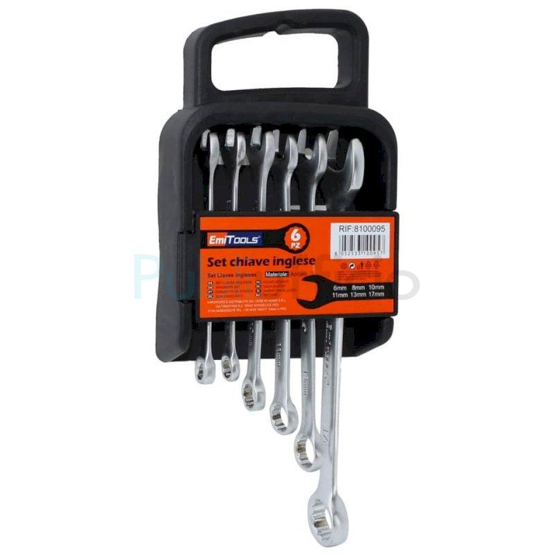 Kit completo di chiavi fisse e a stella in acciaio temperato. Assortito nelle numerazioni più utilizzate(6-8-10-11-13-17 mm). Confezione da 6 pezzi.