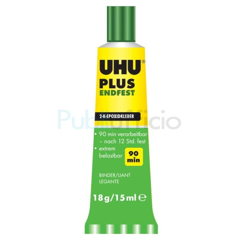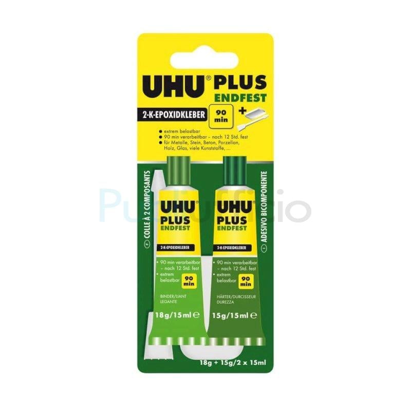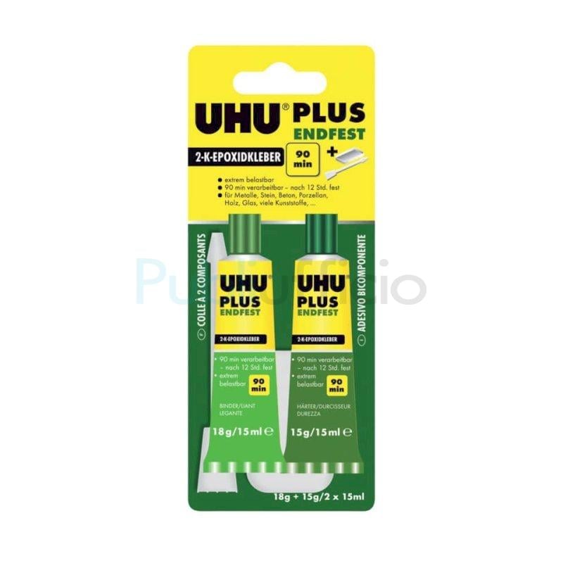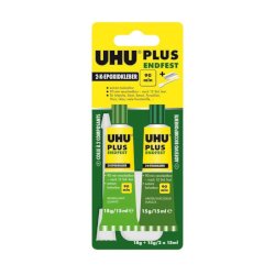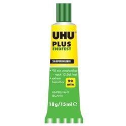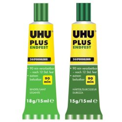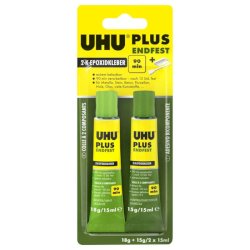 Uhu Plus è un adesivo bicomponente a base di resina epossidica per incollaggi difficili che richiedono un'eccezionale resistenza. Il prodotto consente incollaggi resistenti nel tempo, agli urti, all'umidità e alle temperature (dai – 20°C ai + 100°C). UHU Plus è adatto per incollare molte materie plastiche, metalli, pietra, calcestruzzo, porcellana, ceramica, legno, vetro e derivati del vetro, polistirolo espanso. Caratteristiche: senza solventi, tempo di lavorazione circa 90 minuti, indurimento definitivo a temperatura ambiente dopo 12 ore, velocizzabile con il calore. Rapporto in volume dei componenti 1:1. Una volta indurito è possibile perforare, bucare e biancheggiare. Contenuto 2x15 ml.
