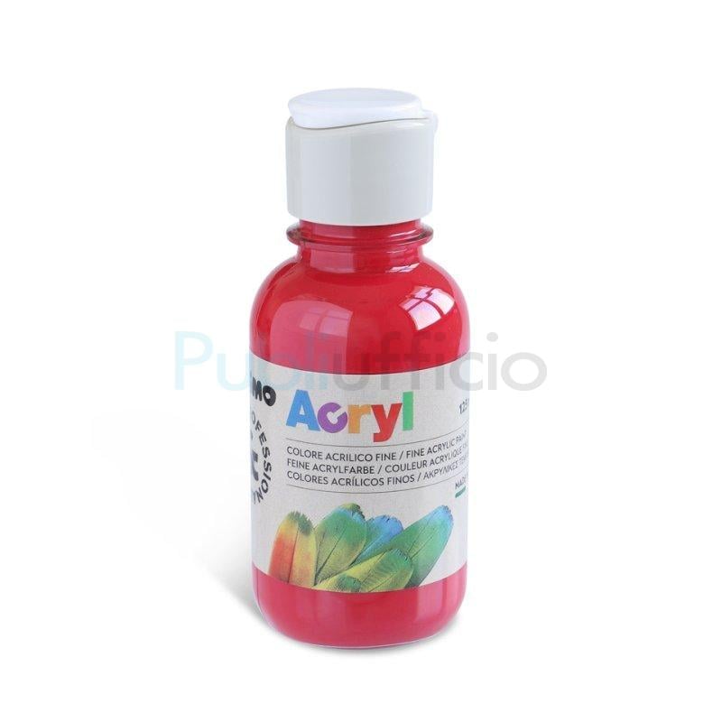 Colore acrilico fine in bottiglia in PET da 125 ml, con tappo dosatore. È un colore ad acqua ad alta concentrazione di pigmento ed emulsione acrilica, di alta qualità, opaco e molto coprente che una volta asciutto è permanente. Si stende facilmente e asciuga in bella superficie rimanendo elastico, di tono vivo e luminoso, piacevole al tatto e resistente. È utilizzabile su qualsiasi substrato, si presta bene alle attività pittoriche proprie di questa tecnica versatile e ricca di possibilità creative. È adatto a tecniche decorative e hobbistiche quali il découpage. È applicabile sulle pareti mediante stencils. I risultati sono di ottimo effetto e durata. Le tinte disponibili in gamma utilizzate pure offrono colori intensi e d’effetto. Colore rosso carminio.