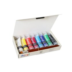 Colore acrilico ad acqua ad alta concentrazione di pigmento di emulsione acrilica, di alta qualità, opaco e molto coprente che una volta asciutto è permanente. Si stende facilmente e asciuga in bella superficie rimanendo elastico, di tono vivo e luminoso, piacevole al tatto e resistente. Bottiglia in PET dotata di tappo dosatore. Confezione composta da 8 colori assortiti e 5 pennelli, formato 75 ml.