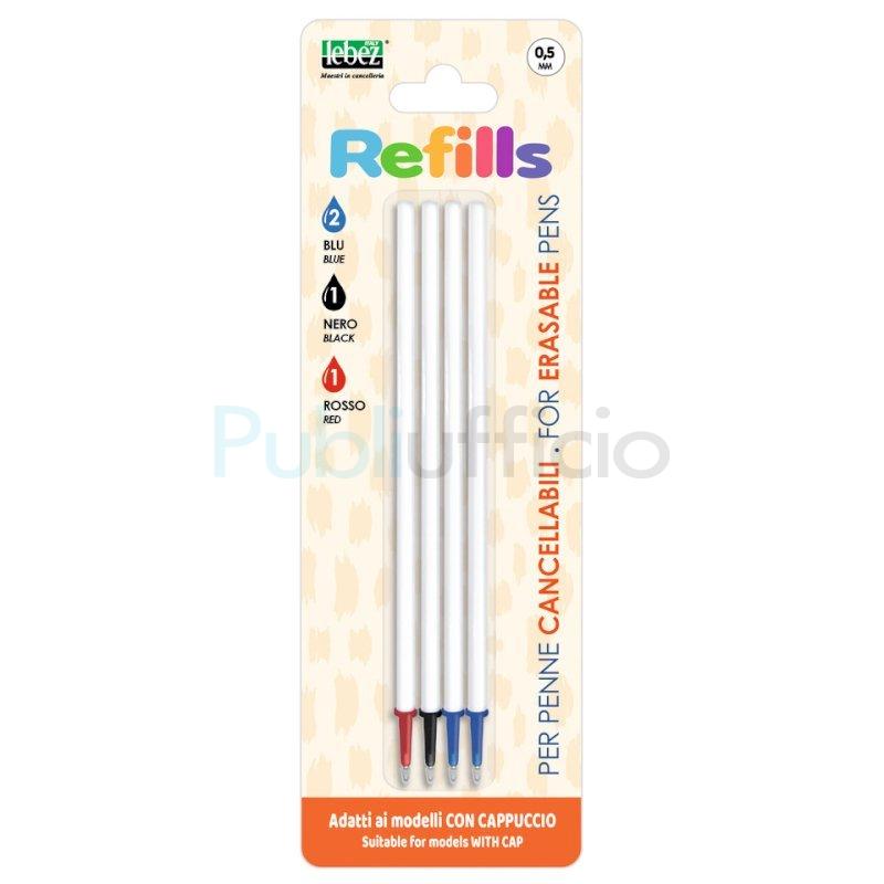Conf. 12 blister da 4 refill inchiostro cancellabile Lebez blu, nero, rosso per penne 0,5 mm con cappuccio - 81808