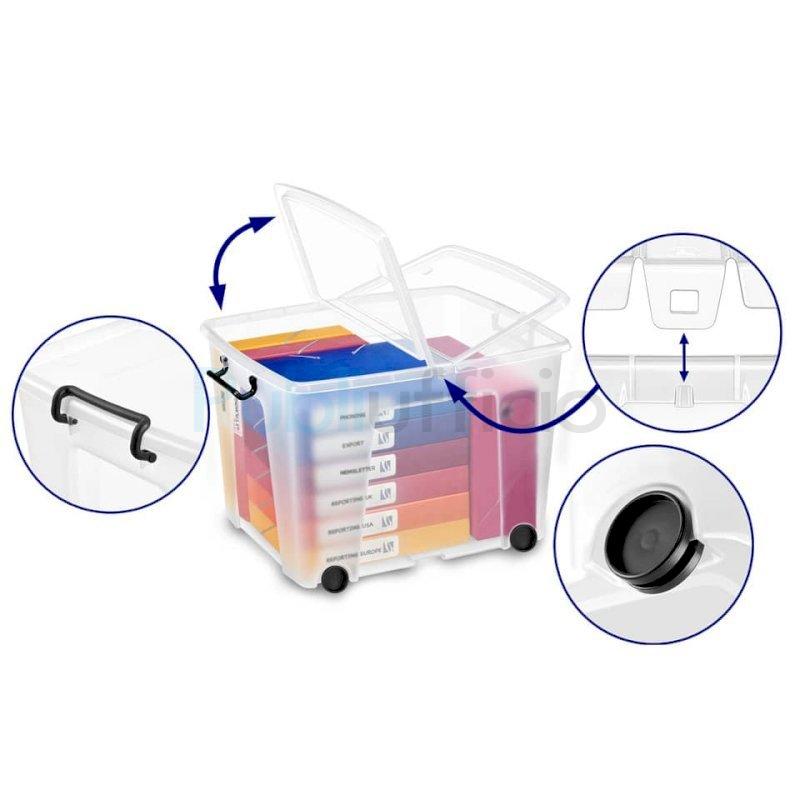 Multi storage box per archiviare documenti e materiali di consumo. Coperchio a farfalla agganciato al centro della scatola, apribile su 2 lati per un facile accesso ai contenuti. 2 fermagli a maniglia solida forniscono una chiusura ben sigillata. Ampia sporgenza attorno al perimetro forma una maniglia per un facile trasporto della scatola. Costruito con pareti solide su tutti e 4 i lati, garantisce un'eccellente robustezza. Impilabile in modo sicuro. Infilabile uno nell'altro grazie alle caratteristiche coniche di ogni contenitore offre la massima efficienza dello spazio durante il trasporto e lo stoccaggio. Realizzato in polipropilene riciclabile. Dim. 485 x 600 H 410 mm.