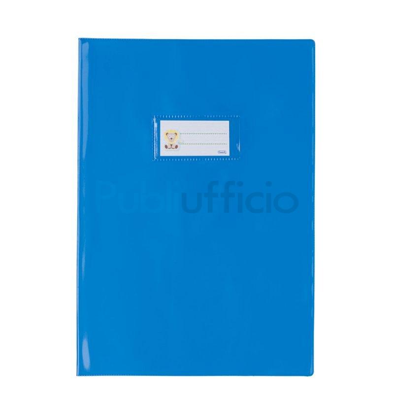 Coprimaxi C25E Francese realizzati in PVC con spessore 250 μm con alette ripiegate da 18 cm, portanome e listelli blocca quaderno centrali. Finitura coprente laccata lucida. 100% riciclabili. Adatti per quaderno A4 - formato 21x29,7 cm. Colore azzurro.