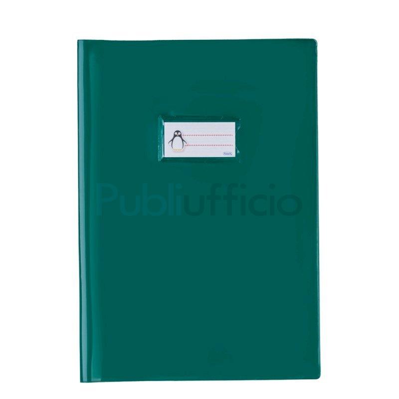 Coprimaxi C25E Francese realizzati in PVC con spessore 250 μm con alette ripiegate da 18 cm, portanome e listelli blocca quaderno centrali. Finitura coprente laccata lucida. 100% riciclabili. Adatti per quaderno A4 - formato 21x29,7 cm. Colore verde scuro.