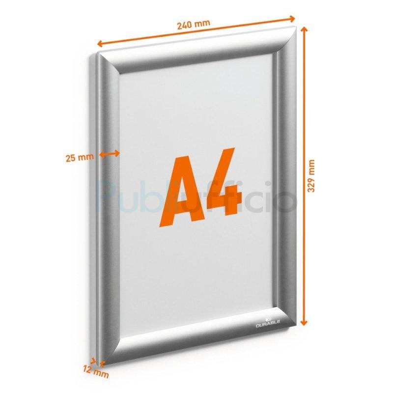 Robusta cornice a scatto formato A4 in alluminio anodizzato. Facile e veloce sostituzione dell'inserto grazie ai profili con apertura a cerniera. Resistente ai raggi UV grazie alla pellicola protettiva antiriflesso. Pannello posteriore in polistirene antiurto. Utilizzabile sia in formato verticale che orizzontale. Fori di affissione nascosti sul retro; la cornice può essere avvitata alla parete o fissata tramite bande biadesive permanenti. Kit di montaggio incluso: viti, tasselli e quattro bande biadesive. Larghezza profilo: 25 mm. Dimensioni esterne (L x H x P): 240 x 329 x 12 mm. Area visibile(L x H): 192 x 279 mm.