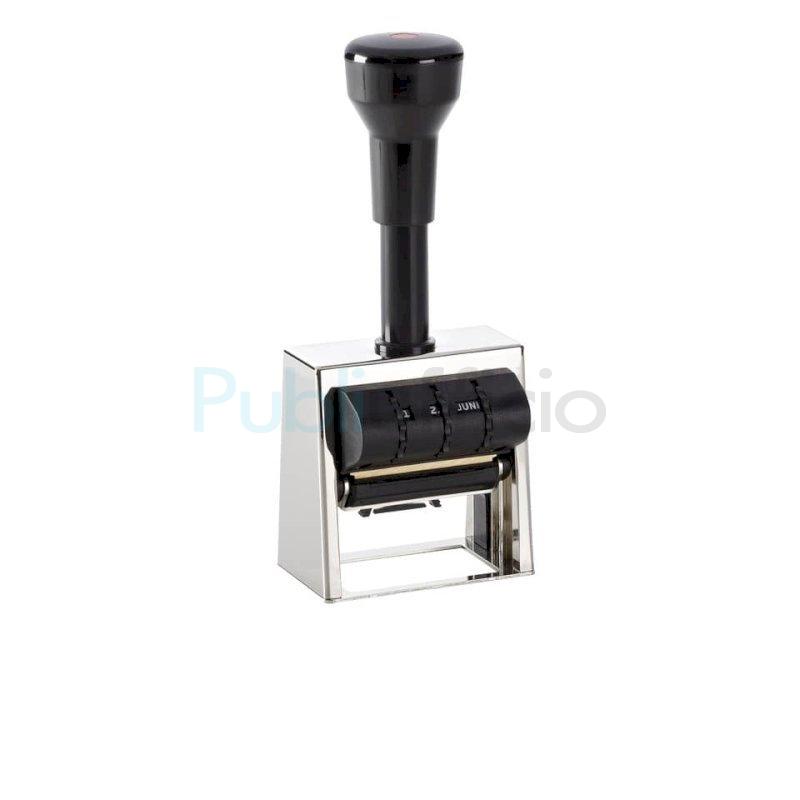 Timbro datario con piastra in ottone personalizzabile max 50x30 mm. Struttura in metallo nichelato con impugnatura ergonomica in plastica. Impostazione della data tramite apposite rotelle. Altezza data 4 mm. Carattere bastone.