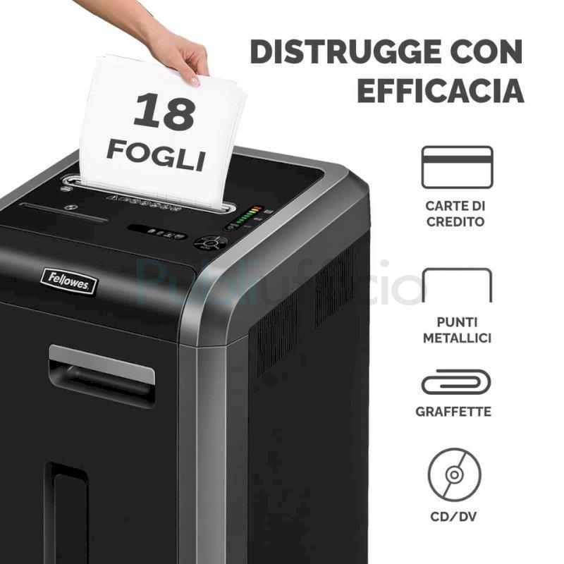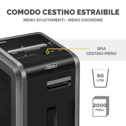 Micro particelle fino a 10 volte più piccole del normale frammento. Distrugge fino a 16 fogli per volta in micro frammenti da 2x12 mm (Livello di sicurezza P-5). Il Sistema 100% Jam Proof elimina gli inceppamenti ed è efficace anche in caso di situazioni difficili. Silent Shred® minimizza la rumorosità permettendo l'uso in ambienti di lavoro condivisi. Il sistema di risparmio energetico riduce i consumi di energia durante l'uso e spegne la macchina dopo 2 minuti di inattività. La tecnologia brevettata Safe Sense® ferma la distruzione se le mani vengono a contatto con l'imboccatura. Motore a ciclo continuo per distruggere senza interruzioni. Cestino estraibile, per un facile svuotamento, da 60 litri. Distrugge graffette, punti metallici, carte di credito e CD. Per 5+ utenti. Garanzia: 2 anni sulla macchina, 7 anni sulle lame.