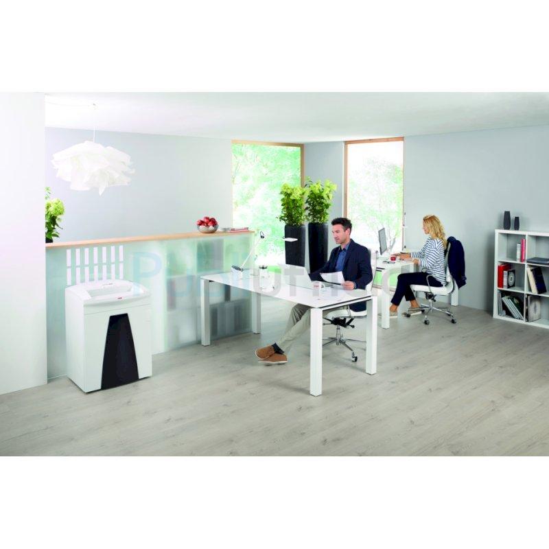 Questo distruggidocumenti di prima classe, dal design elegante, garantisce la sicurezza dei dati nei grandi uffici. La luce di taglio da 310 mm consente la distruzione di carta A3. Taglia: 30-32 fogli di carta 80 gr nella versione a strisce da 5,8 mm e 21-22 fogli di carta 80 gr nella versione a frammenti da 4,5x30 mm, carte di credito e CD. Grazie alla potente trasmissione, distrugge in maniera affidabile e silenziosa la quantità di dati prodotta da un massimo di 8 persone. I materiali pregiati e la rinomata qualità ''Made in Germany'' garantiscono sicurezza e una lunga durata. Con garanzia di 3 anni. Alberi di taglio in acciaio massiccio temprato con garanzia a vita. Il potente motore garantisce elevate prestazioni di taglio ed un affidabile funzionamento a ciclo continuo. Funzionamento silenzioso. Consumo energetico estremamente ridotto, solo 0,1 W in modalità stand-by con il controllo intelligente EcoSmart. Il distruggidocumenti ha ottenuto il riconoscimento Angelo Blu per la costruzione durevole, il ridotto consumo energetico e l'uso di materiali ecocompatibili. La tecnologia anti inceppamento con funzione di reverse automatico previene il blocco della carta. L'elemento di sicurezza con vano d'introduzione CD impedisce l'alimentazione involontaria e funge da protezione antischeggia durante la distruzione di CD. Con il tasto multifunzione, l'apparecchio può essere utilizzato in modo intuitivo. Start/stop automatico. Il distruggidocumenti è trasportabile in maniera comoda e semplice su ruote. Dopo avere aperto lo sportello, il sacco di raccolta estraibile e riutilizzabile da 100 litri può essere comodamente prelevato e svuotato. L'utilizzo di un sacchetto separato consente la raccolta differenziata del materiale triturato. Il distruggidocumenti è dotato di un robusto mobile in legno con angolo di apertura della porta particolarmente ampio. La bassa emissione di polveri è stata certificata presso un istituto indipendente: l'utilizzo direttamente sul posto di lavoro è sicuro. Un LED indica quando il contenitore è pieno e la macchina si spegne automaticamente. Attraverso la finestra d'ispezione, il livello di riempimento del contenitore di raccolta è visibile in qualsiasi momento. Dimensione LxPxH: 54,1x43,9x84,5 cm.