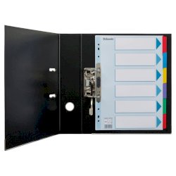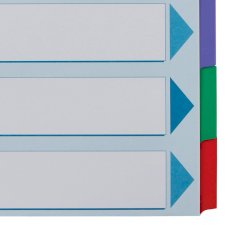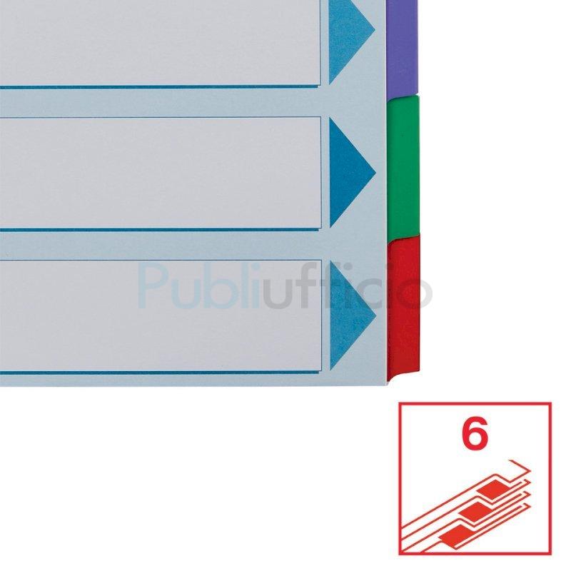 Pagina indice in cartoncino con un design a frecce blu e azzurre e rinforzi in mylar sul lato forato. Tasti colorati e rinforzati in mylar, tagliati e stampati su entrambi i lati per rintracciare facilmente i documenti precedenti senza dover tornare alla pagina indice. Ideale per formati A4, dimensioni (LxAxP): 22,5 x 29,7 x 0,2 cm. Consente di suddividere i documenti inseriti in buste a perforazione universale. Confezione composta da 20 fogli da 6 tasti colorati ciascuno.