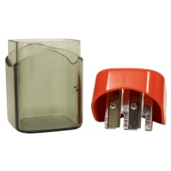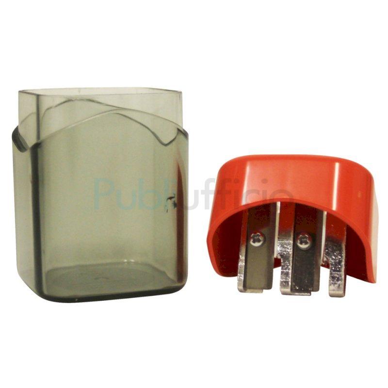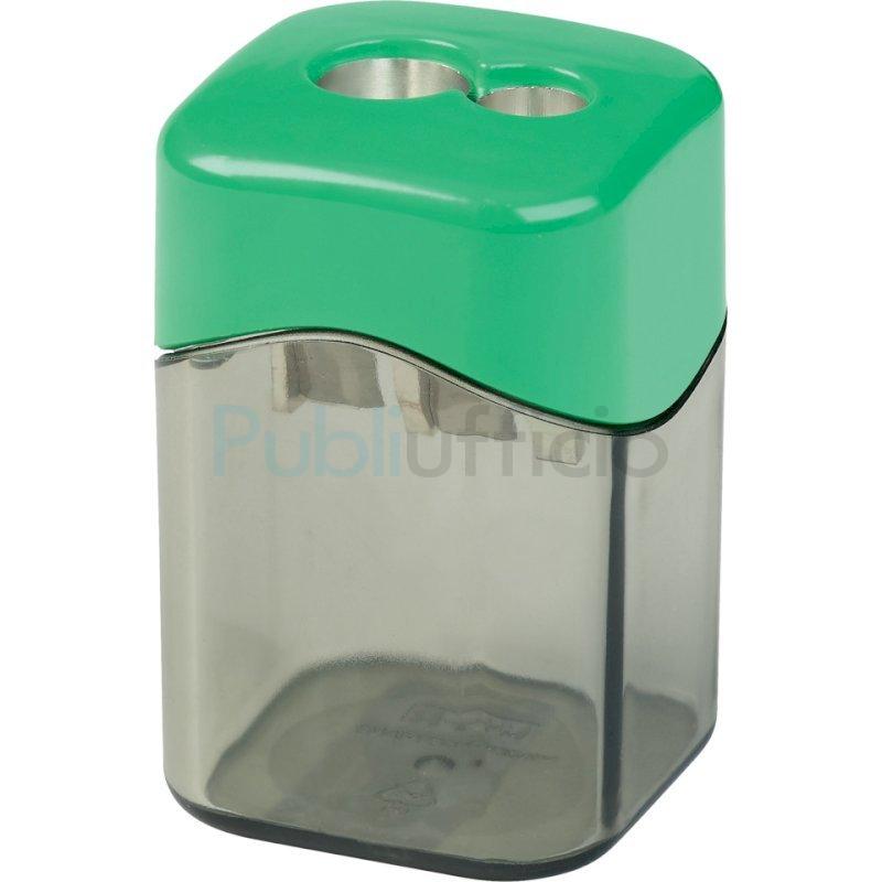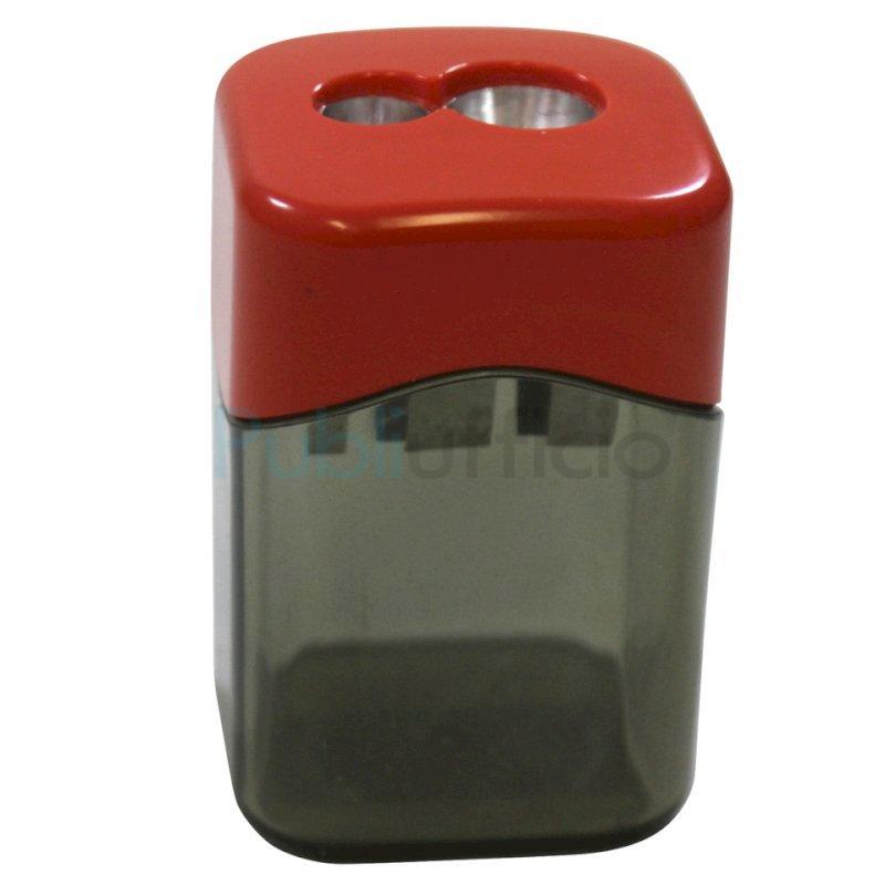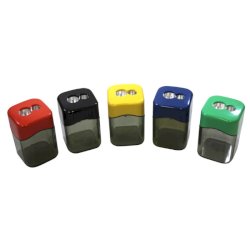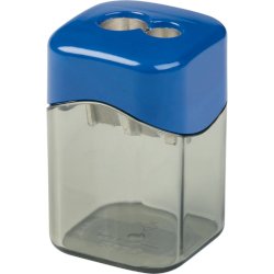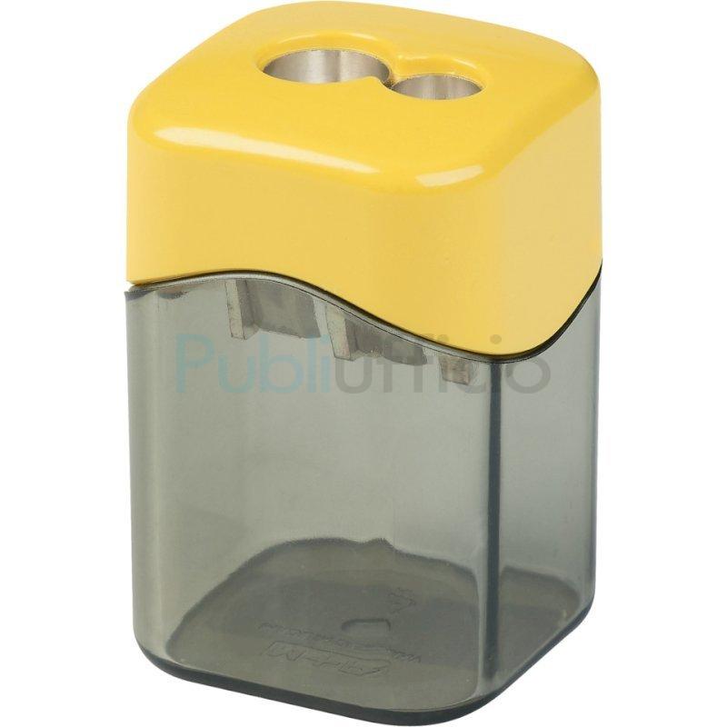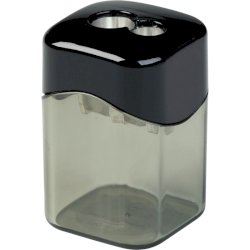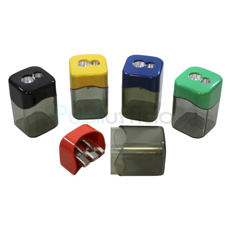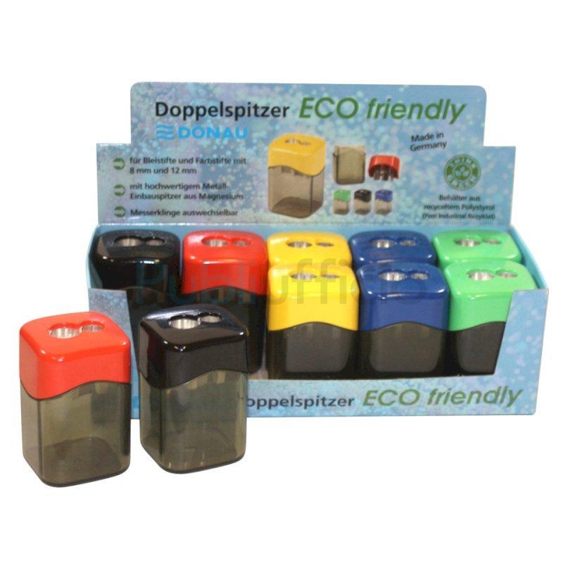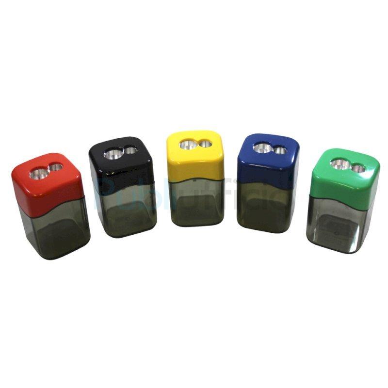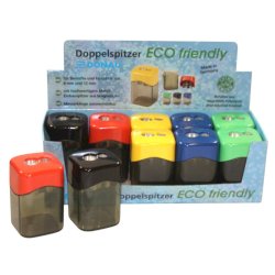 Temperamatite a 2 fori con serbatoio per destrimani, corpo in polistirolo riciclato (post-industriale). Lama in metallo di alta qualità sostituibile. Adatto per matite e matite colorate da 8 mm e 12 mm, rotonde, esagonali e triangolari. Disponibile in colori assortiti: giallo, rosso, verde, blu, nero. Dimensioni: 3,6 x 3,6 x 5,7 cm. Espositore da banco composto da 10 pezzi.