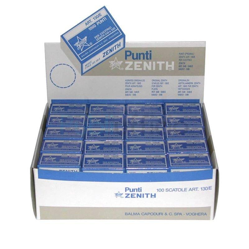 Punti 130/e S100 in acciaio naturale. Espositore composto da 100 scatole da 1.000 punti ciascuna. Lunghezza gambine 4 mm. Tipo di punto 6/4. Compatibili con cucitrici Zenith mod. 530/548/548e/548e2/590. Capacità 15 fogli. I punti ''ZENITH'' si distinguono per la qualità dell'acciaio e per l'affilatura delle estremità delle gambine, accorgimento che ne garantisce una migliore penetrazione nella carta.