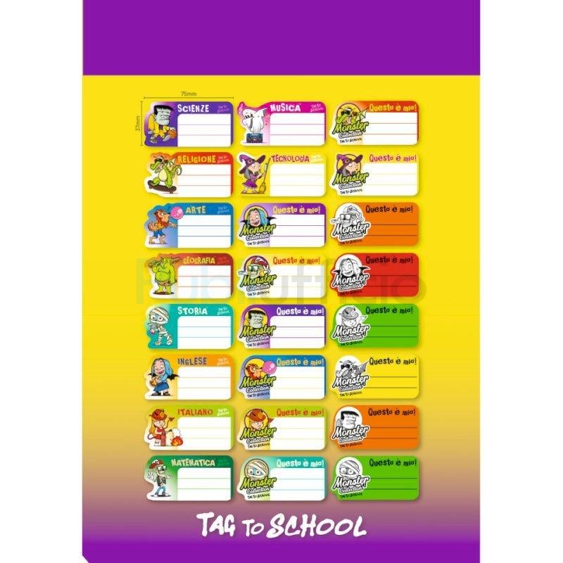 Espositore contenente 50 bustine di etichette Fluo assortite (20 giallo fluo, 10 arancio fluo, 10 verde fluo e 10 rosso fluo) + 50 bustine etichette stampate “Monster Collection”. Ogni bustina contiene 36 etichette formato 75 x 37 mm.
