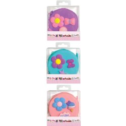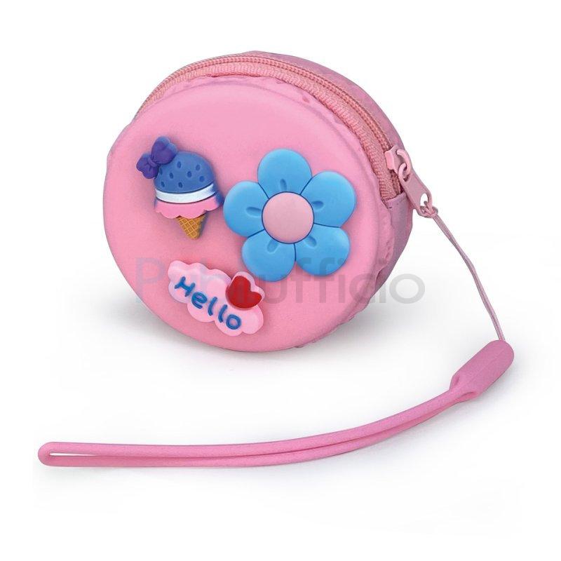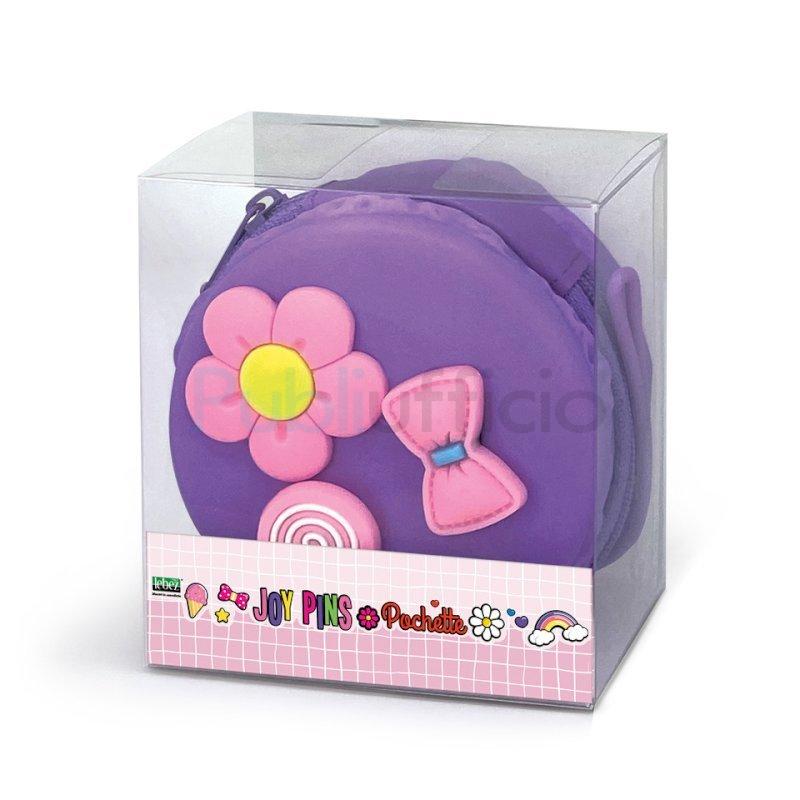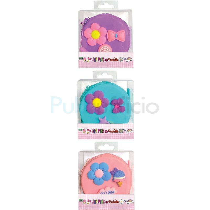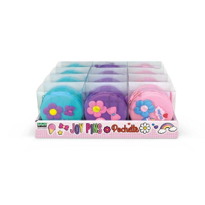 Espositore composto da 12 pochette in silicone Joy Pins, dotate di zip, laccetto e decorazioni con clip 3D completamente removibili e intercambiabili. Formato pochette: Ø 7,5 cm x 4 cm. Disponibili in 3 soggetti assortiti.