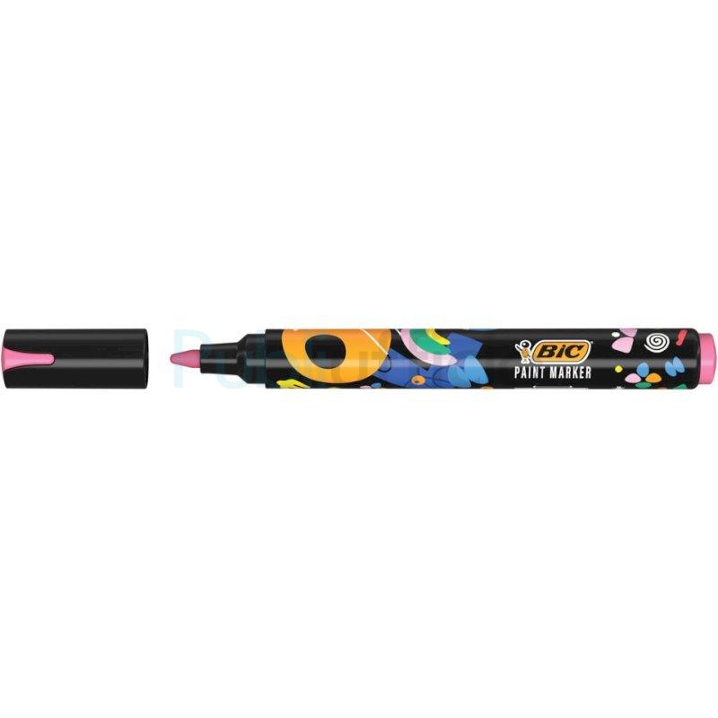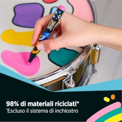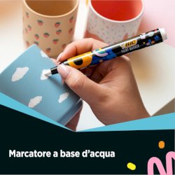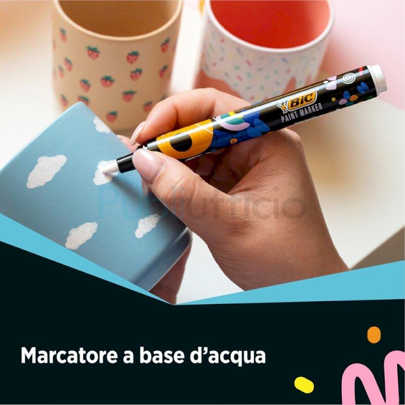 Marcatori a vernice a base d'acqua BIC Intensity Paint Markers. Pronto all'uso senza bisogno di agitare o premere la punta. Realizzati con materiali riciclati al 98% (escluso il sistema di inchiostro), questi pennarelli atossici hanno una punta media da 4,5 mm per un tratto da 1,5-2,3 mm. Funzionano all'interno e all'esterno sulla maggior parte delle superfici, anche quelle scure: pietra, ceramica, vetro, legno, tessuto, cartone, plastica, metallo e altro ancora. Espositore composto da 120 marcatori in colori vivaci assortiti: 24 nero, 24 bianco, 12 blu, 12 rosso, 12 giallo, 12 verde, 12 viola, 12 rosa.
