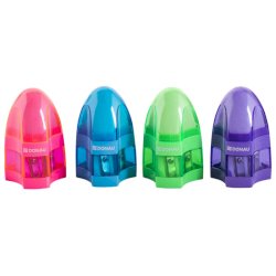 Temperamatite 2in1: cancella e tempera grazie all'originale composizione con gomma bianca a punta nella parte superiore e un temperino a due fori nella parte inferiore. Realizzata con rivestimento in plastica in 4 colori e forma a tema spazio che ricorda un'astronave. Tempera matite da 8 a 12 mm, rotonde, esagonali e triangolari. Lama non sostituibile, altezza 6,5 cm, diametro 4 cm. Disponibile in espositore da banco da 16 pezzi.