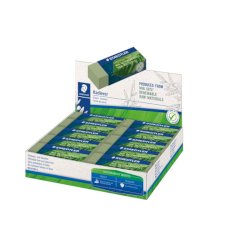 Espositore 20 gomme eco Staedtler verde oliva. Gomma realizzata fino al 56% di materie prime naturali e rinnovabili. Misura gomma singola: 65 x 23 x 13 mm. Carta protettiva fino al 100% in materiale naturale, ottenuto dai sottoprodotti della raccolta della canna da zucchero. Gomma senza ftalati e lattice. Made in Germany.