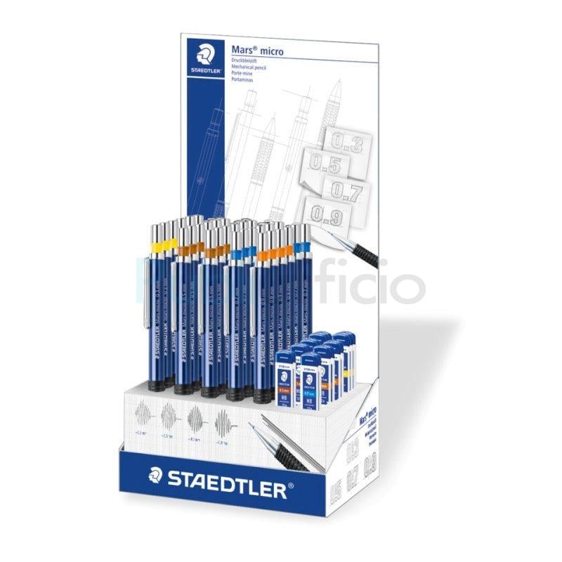 Mars® micro, espositore con 30 portamine assortiti ( 4x 0,3 mm - 14x 0,5 mm - 8x 0,7 mm - 4x 0,9 mm) e 18 astucci di mine HB in gradazioni assortite ( 3x 0,3 mm - 9x 0,5 mm - 3x 0,7 mm - 3x 0,9 mm). Disponibile con 18 astucci di mine assortite.