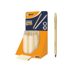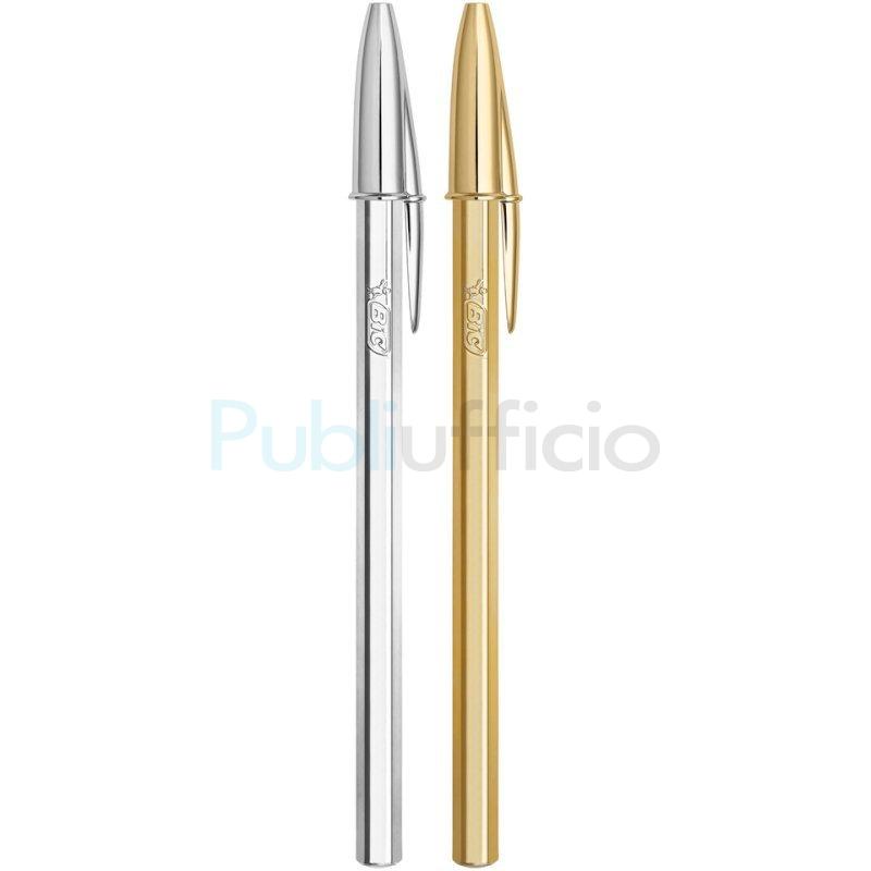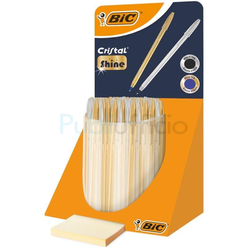 Penna a sfera Bic Cristal edizione speciale in fusto oro e argento. Espositore da banco contenente 40 penne assortite: 20 penne fusto oro (inchiostro blu) e 20 fusto argento (inchiostro nero).