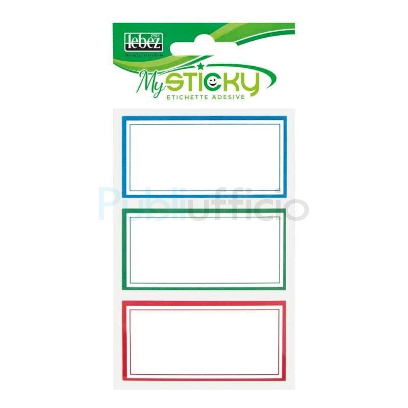 Etichette adesive con bordo, adatte per la scuola. Confezione composta da 18 etichette in tre colori assortiti: verde, rosso e azzurro. Formato 7 x 3,5 cm.