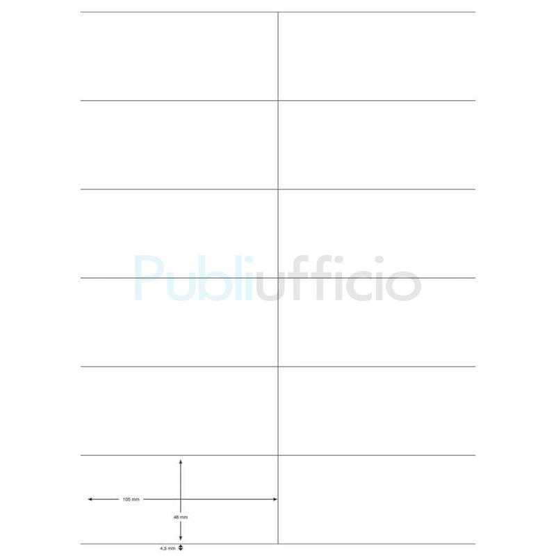Etichette universali 105x48 mm, colore bianco. Margine superiore e inferiore foglio 3,63x3,63 mm. Confezione 100 fogli, 12 etichette per foglio, 1200 etichette complessive. Grammatura 70 gr/mq. Forma rettangolare, non removibili. Angoli squadrati. Carta certificata FSC.