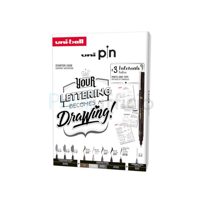 Questo Starter Kit Uni Pin è stato appositamente studiato per gli artisti dilettanti o professionisti che vogliono cimentarsi con il Lettering. Contiene anche tutorial dettagliati con tutto quello che c’è da sapere su queste due tecniche artistiche. Ogni Starter KIT contiene 5 fineliner Uni PIN con punta calibrata+ 3 fineliner uni PIN con punta pennello+ 1 portamine Shalaku, 3 lezioni di disegno, passo dopo passo per imparare le tecniche del lettering.
